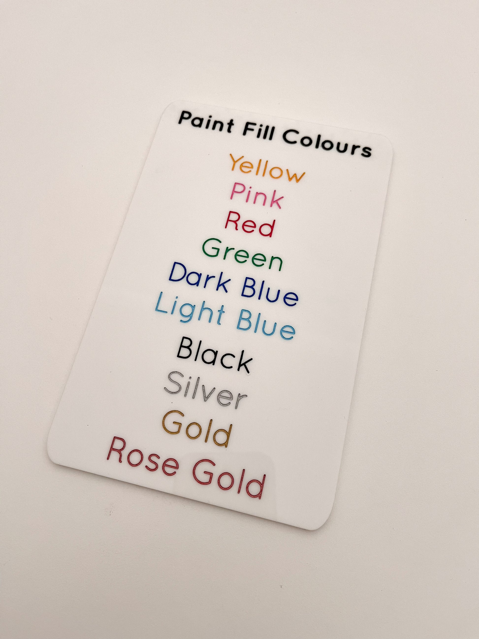 *NOTE paint fill colour acrylic swatch chart is done on white there must be a high enough contrast between the colour acrylic and the paint colour otherwise the QR codes will not work.