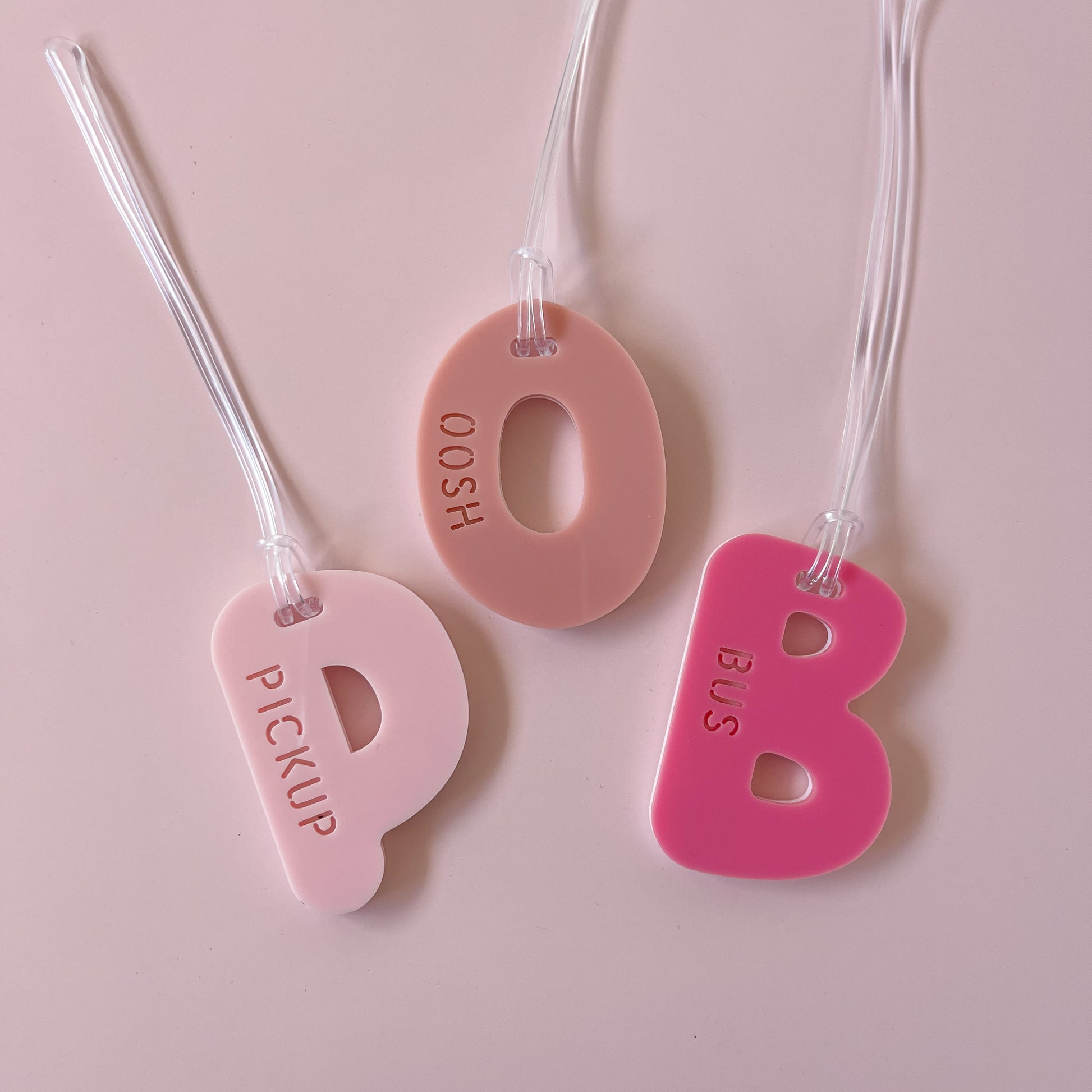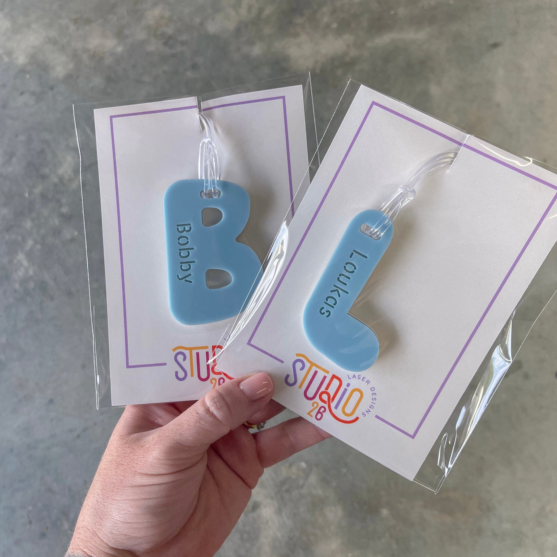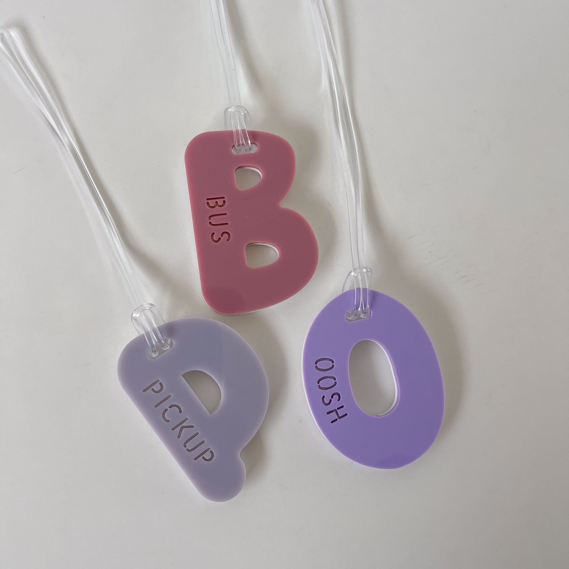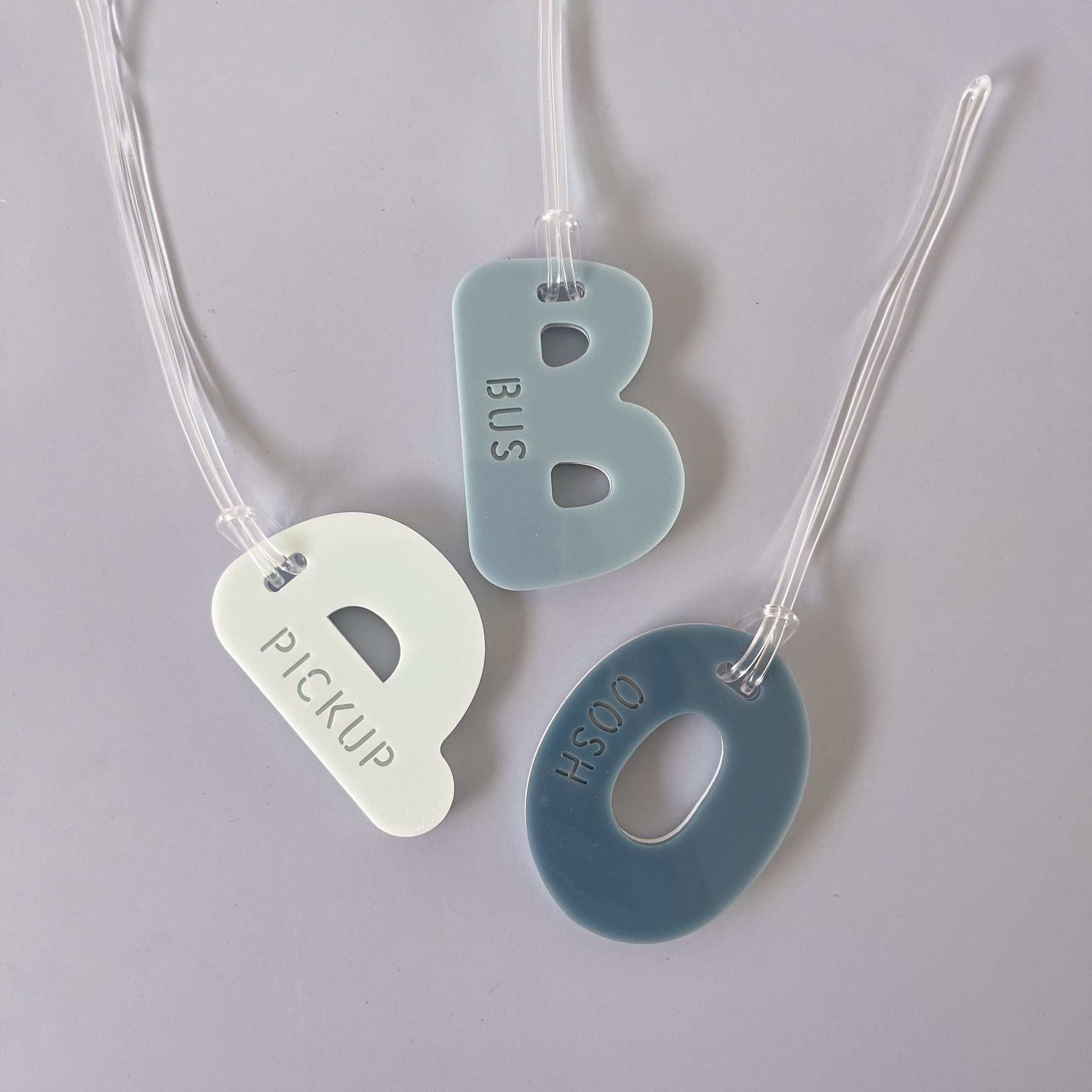 Sizing varies depending on the initial "B" is 4.5x7cm all tags are made from 2 layers of 3mm thick acrylic. White is used for the base and a colour for the top.