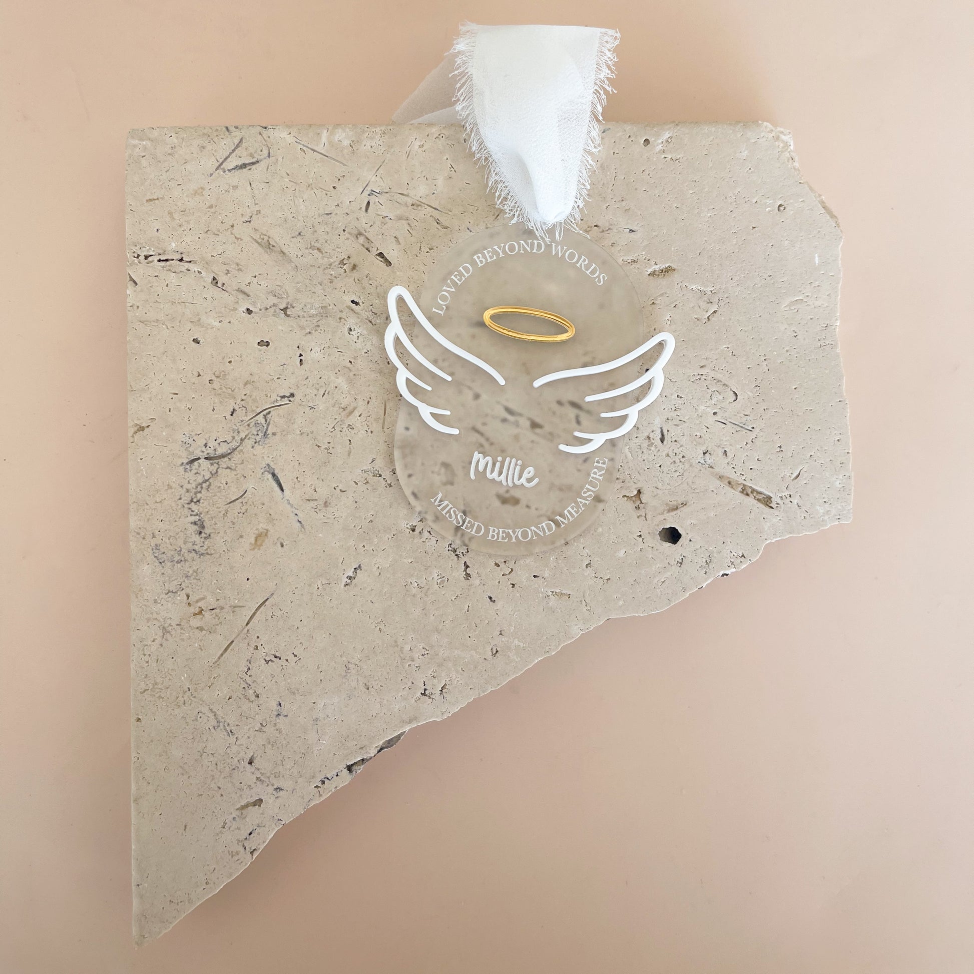 All ornaments feature white angel wings with a mirror gold halo and the text 'Loved beyond words, missed beyond measure'