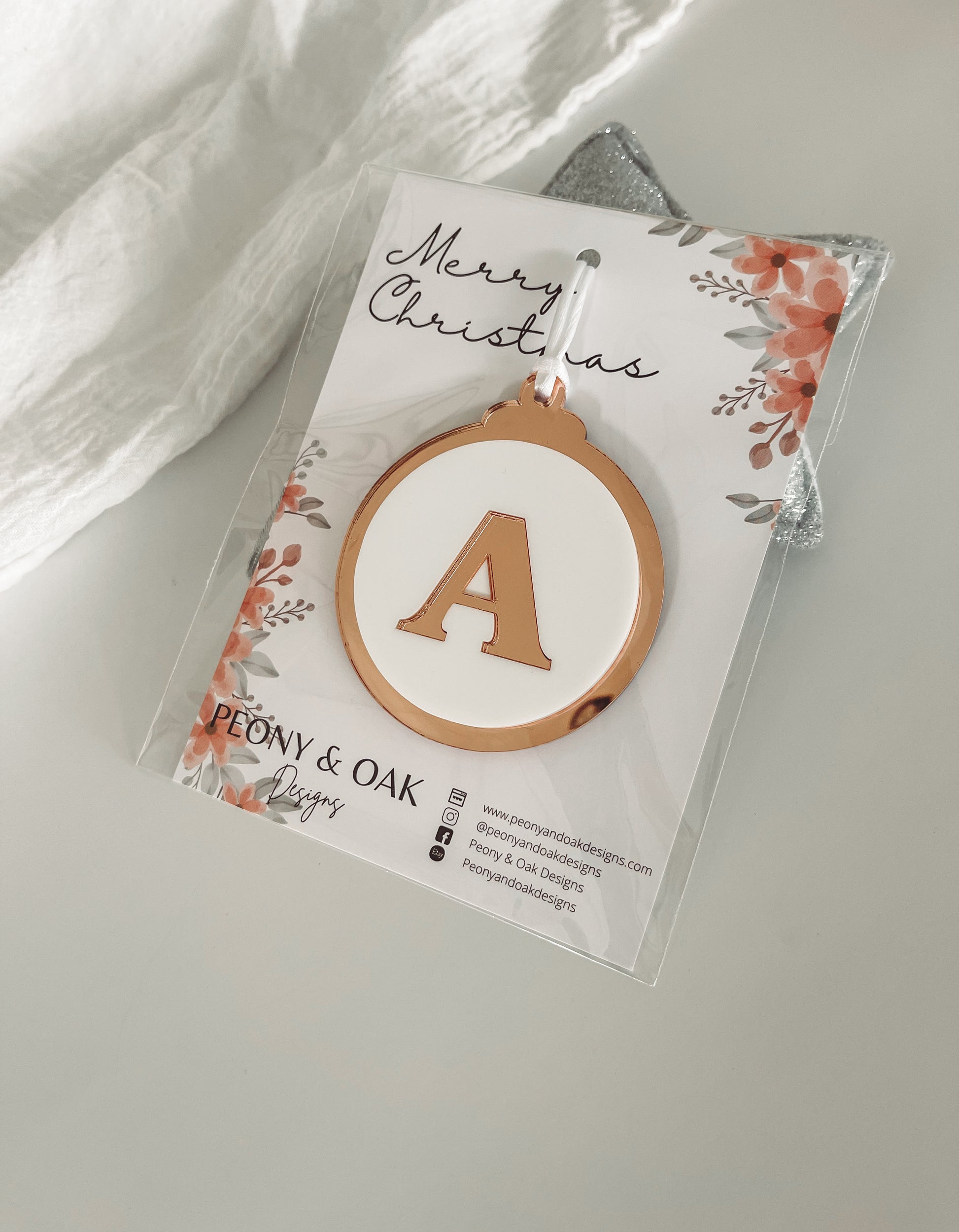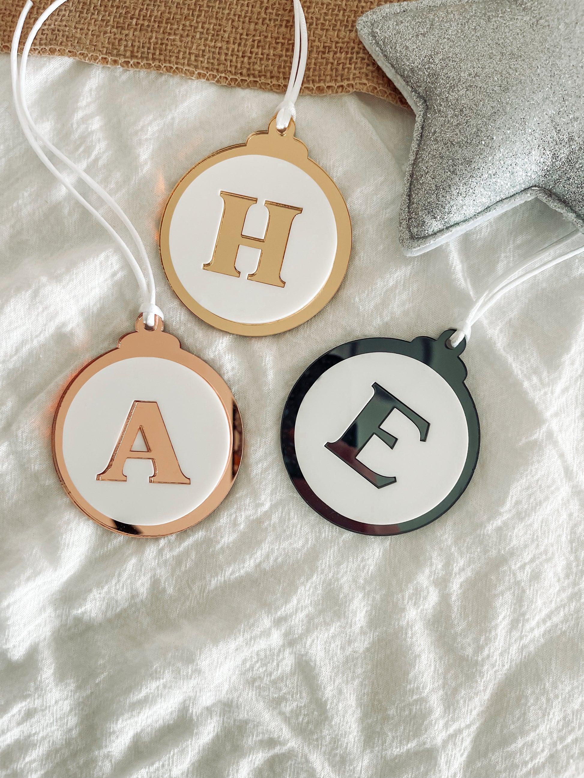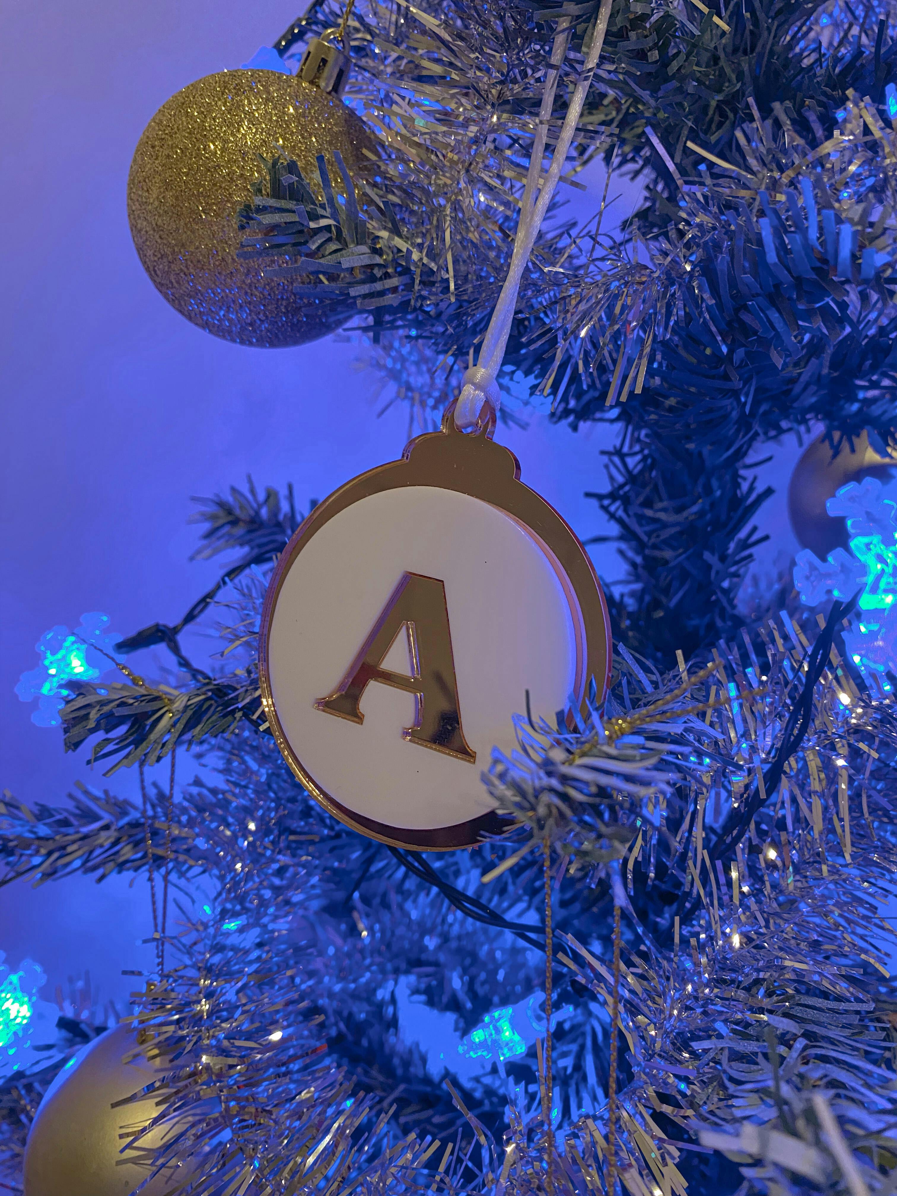 A new addition to our bauble range is this stunning double layered acrylic bauble with a set in initial.