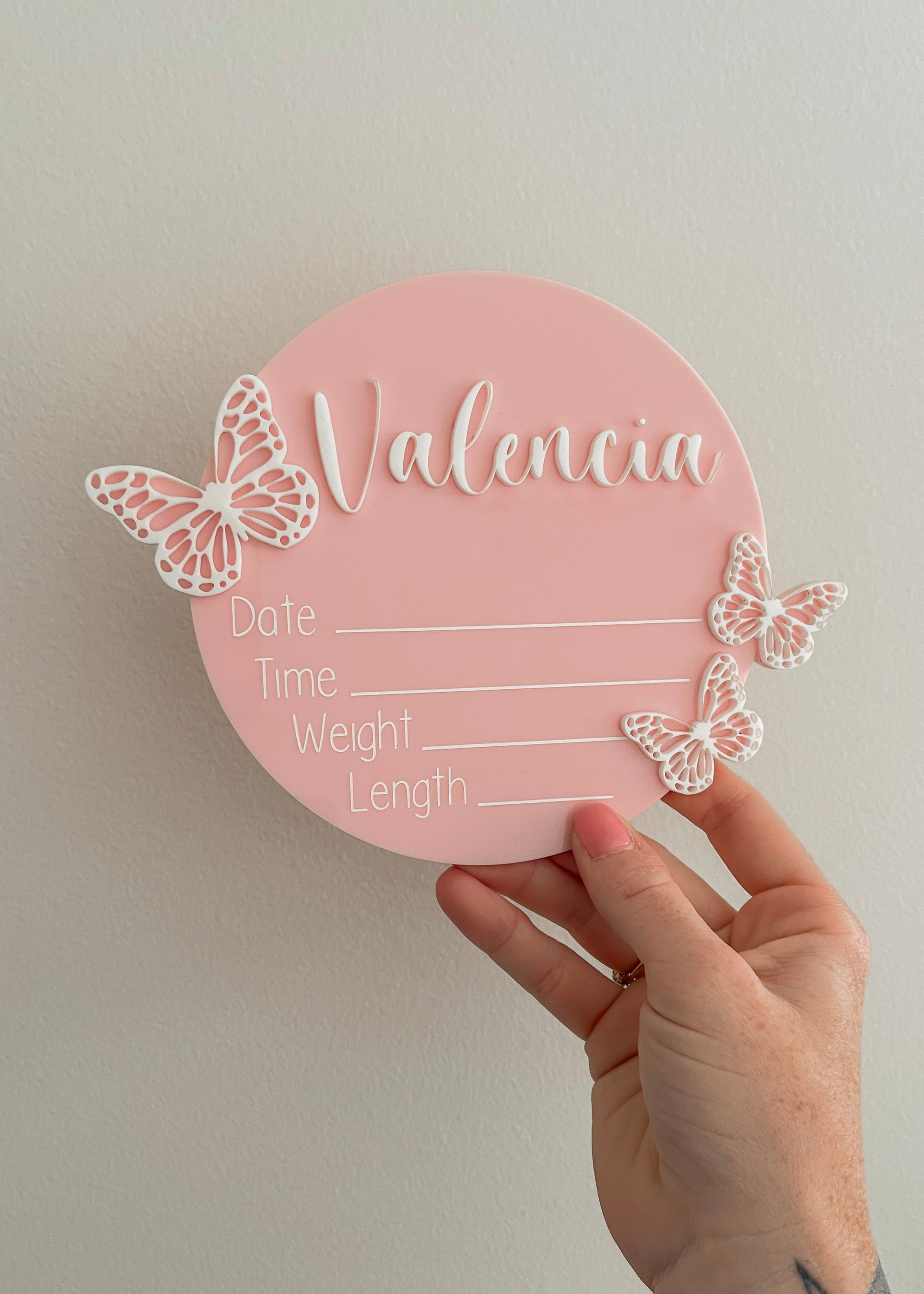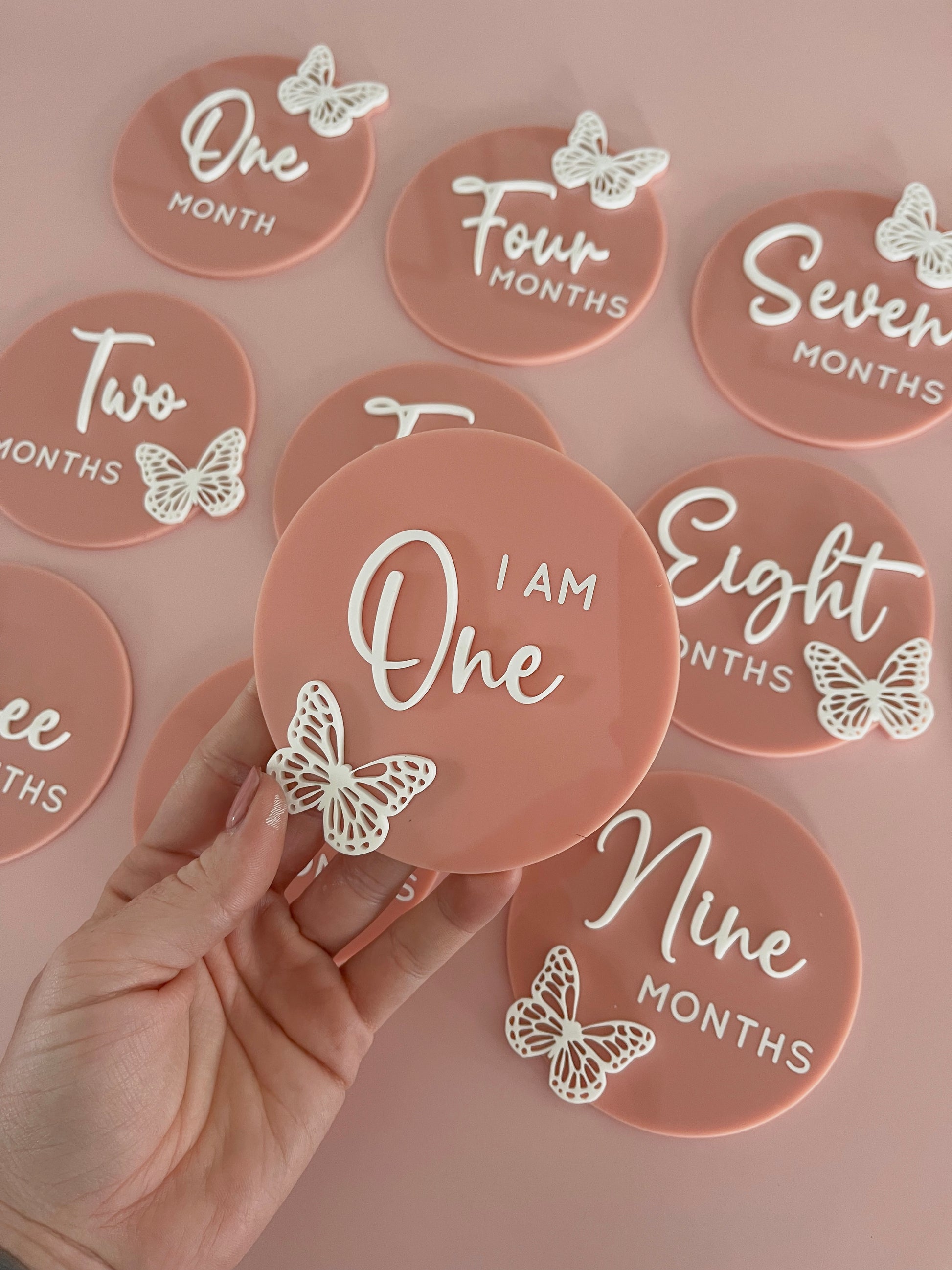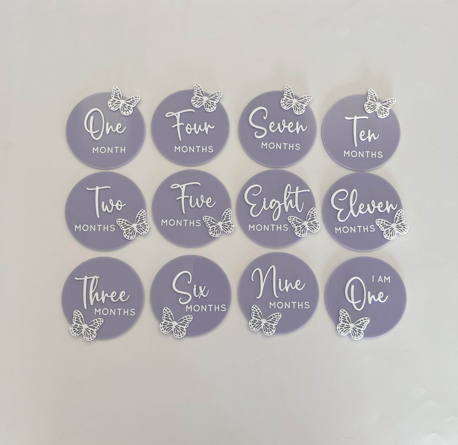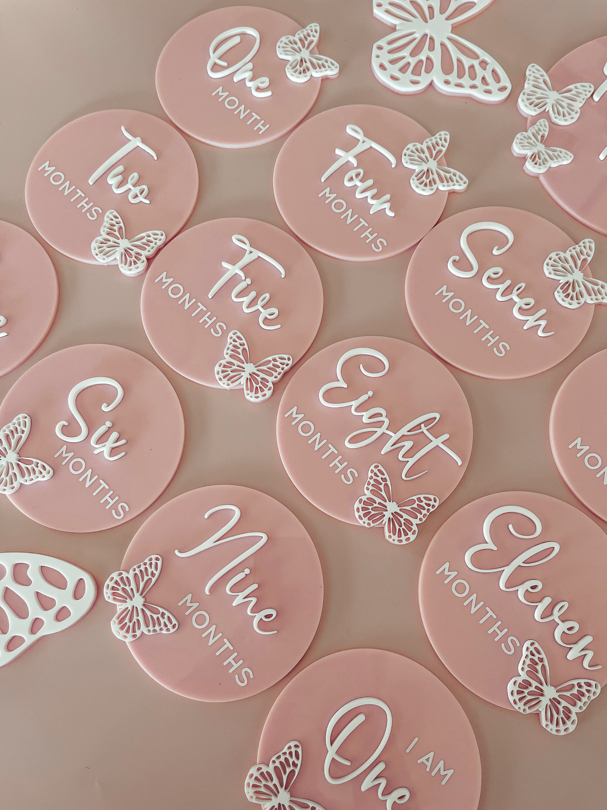 They are made with double layered 3mm thick acrylic, apron 10cm in diameter and are available in a large variety of colours to go with every theme, this set pairs perfectly with our Butterfly Birth Announcement Disc!