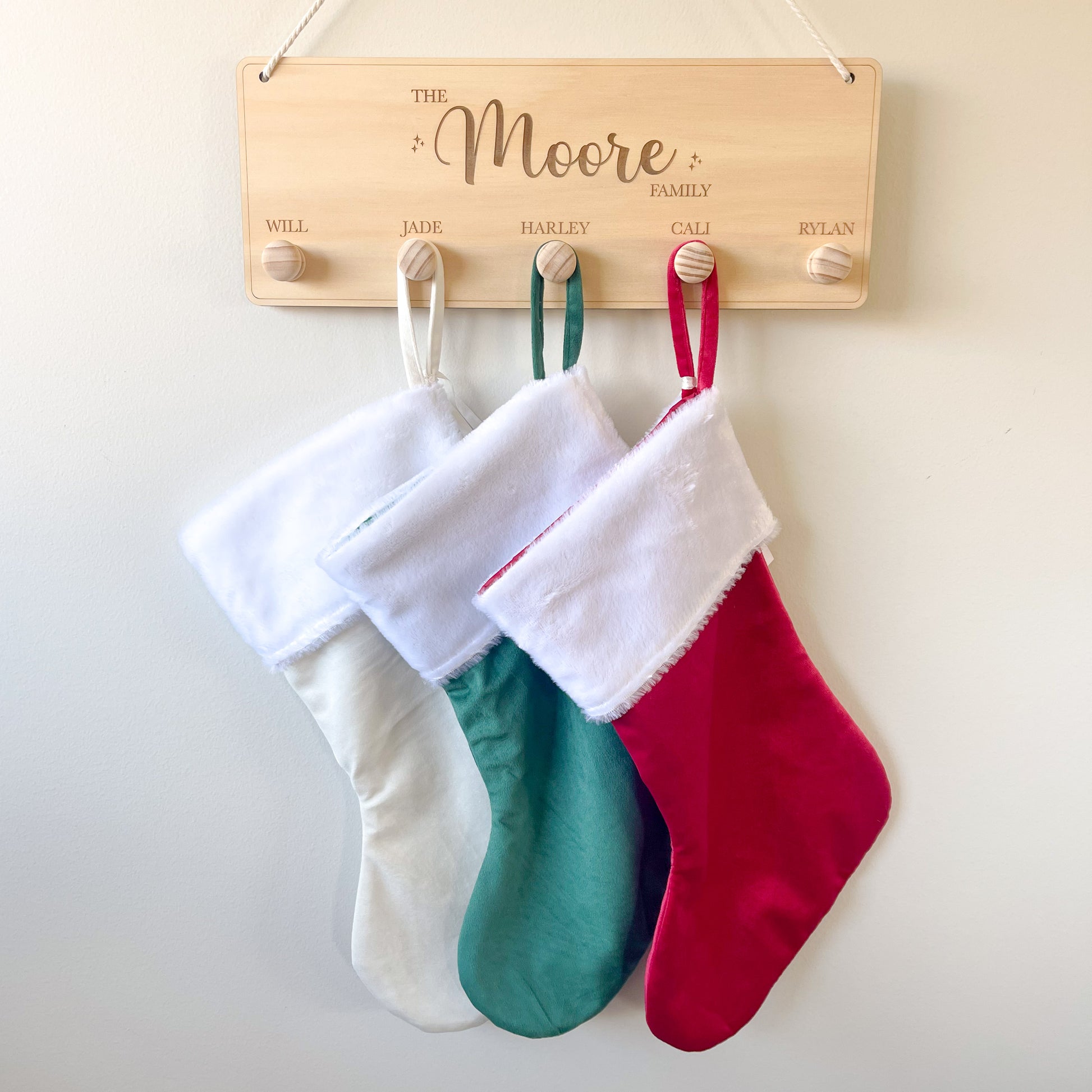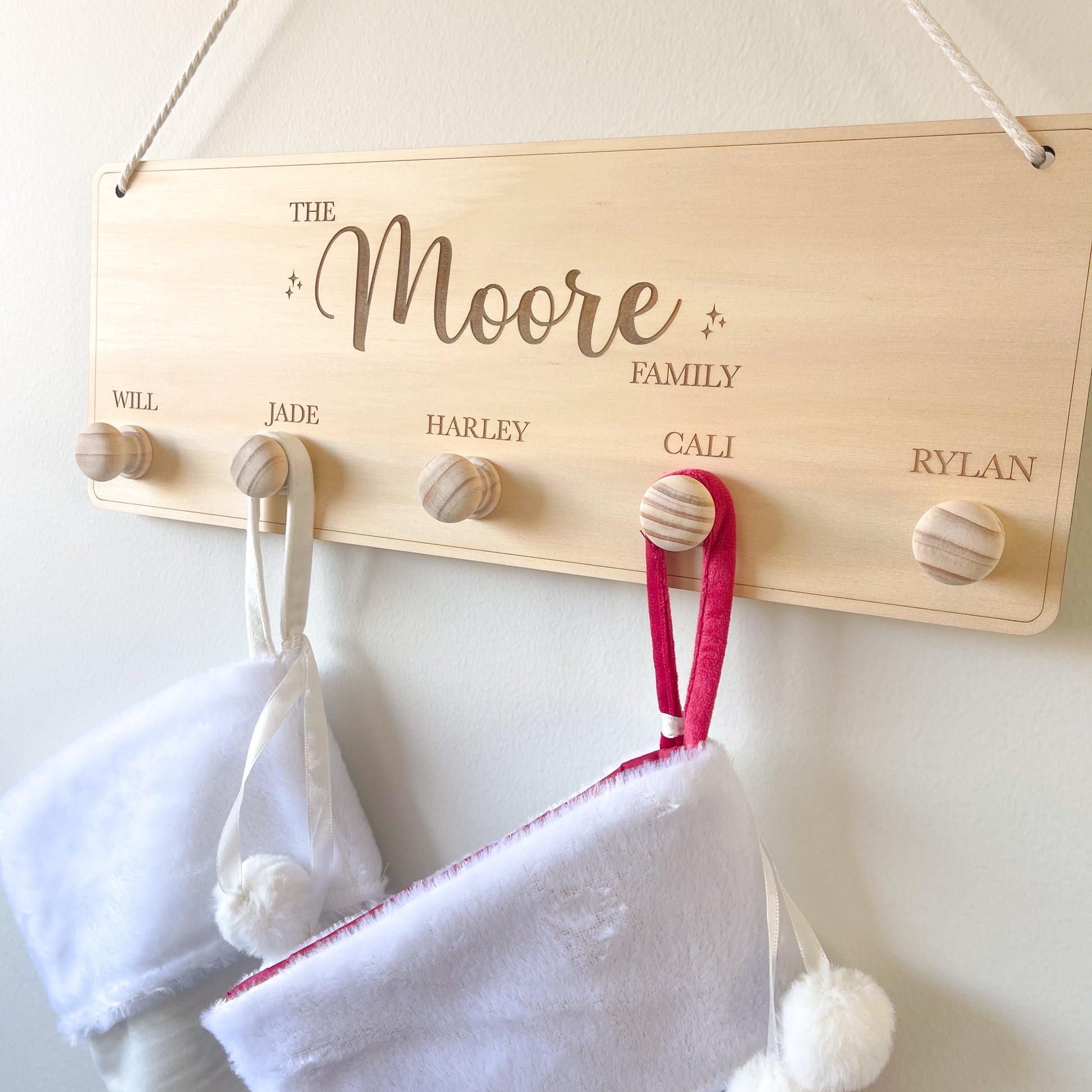 Hang your stockings in style with our Christmas Family Stocking Holder. No more need for nails or tacks, this holder securely holds up to 6 stockings, perfect for those with no fireplace.