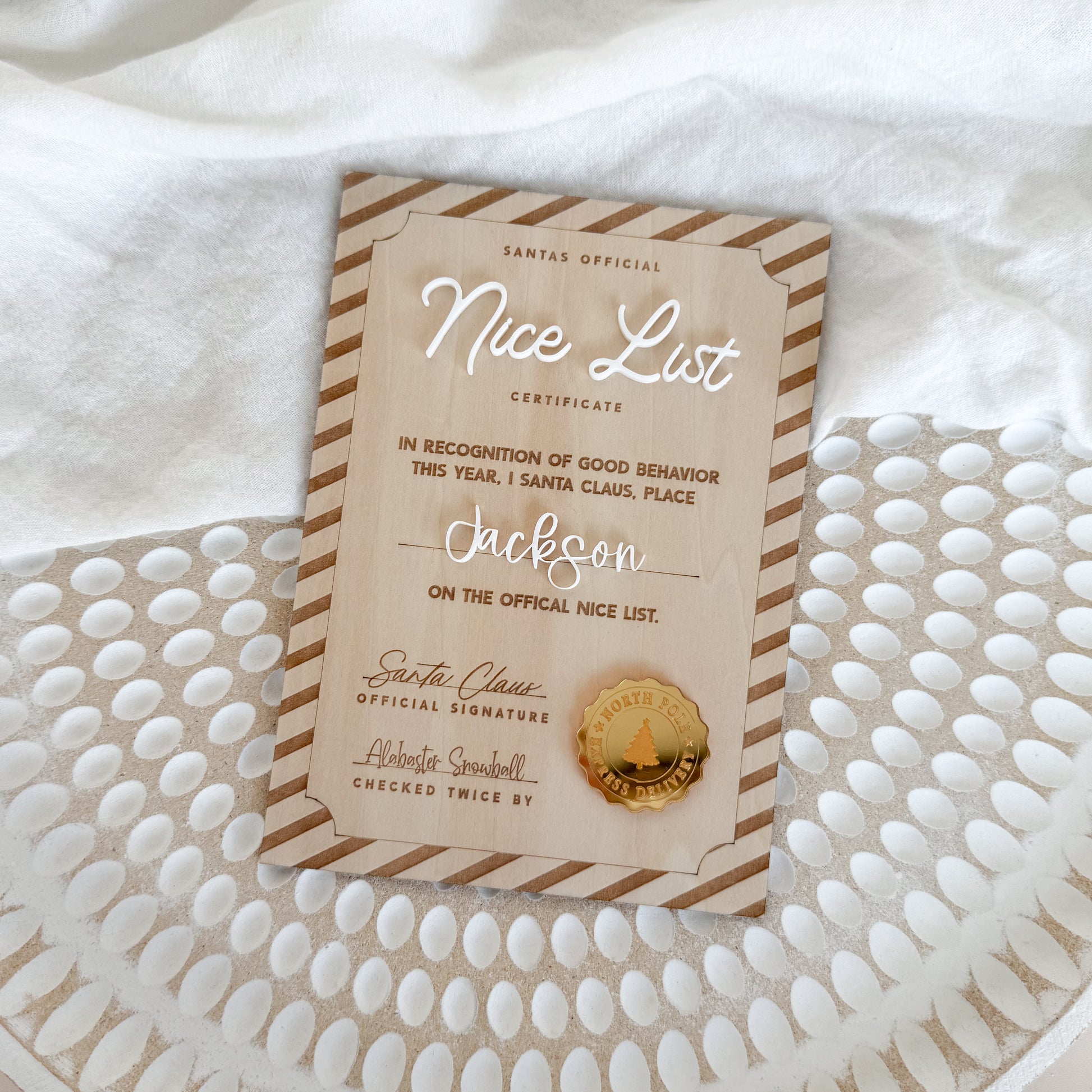 Each certificate is beautifully crafted from premium wood and features your child’s name in raised white acrylic, engraved text straight from the North Pole, and a shiny mirror “North Pole Seal of Approval” for the perfect finishing touch.