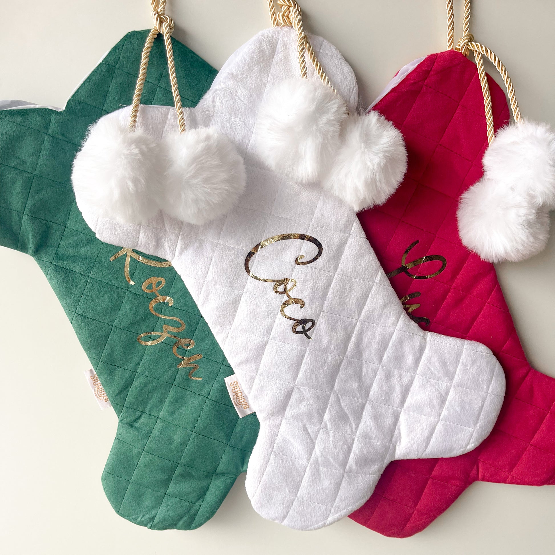 Each stocking comes personalised with the name of your choice using a high quality, long lasting metallic gold heat transferred vinyl.