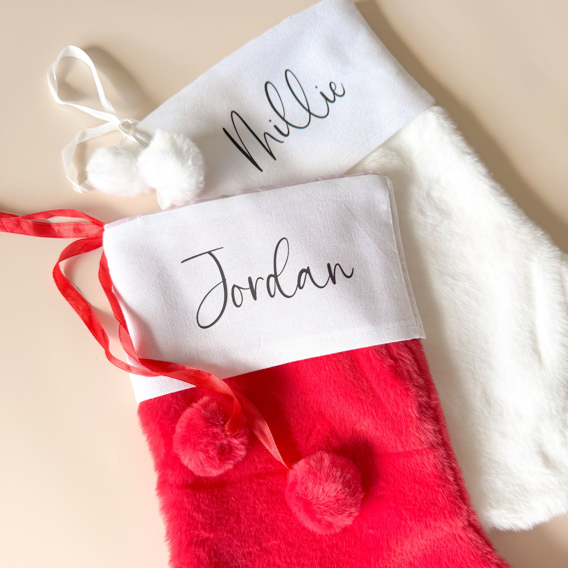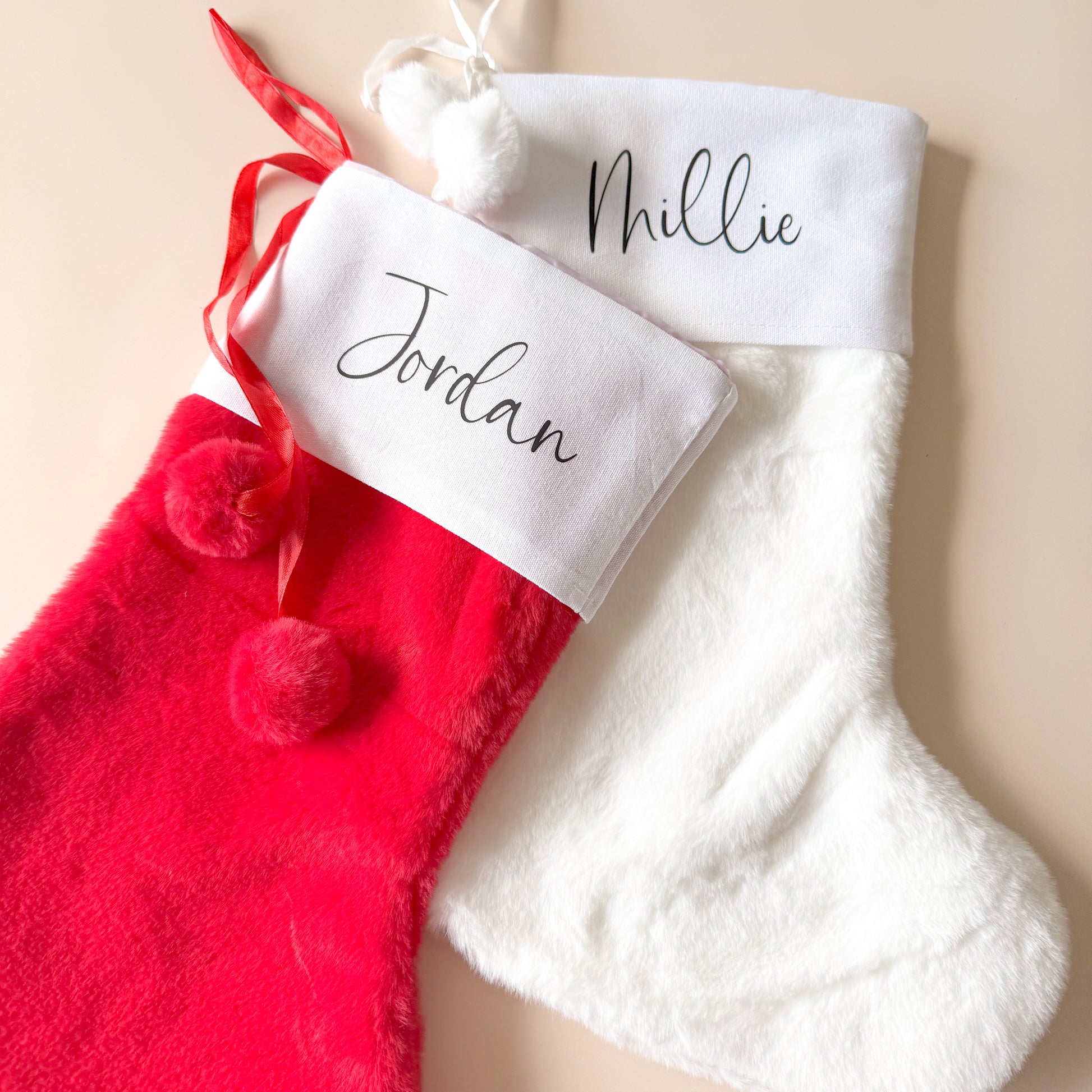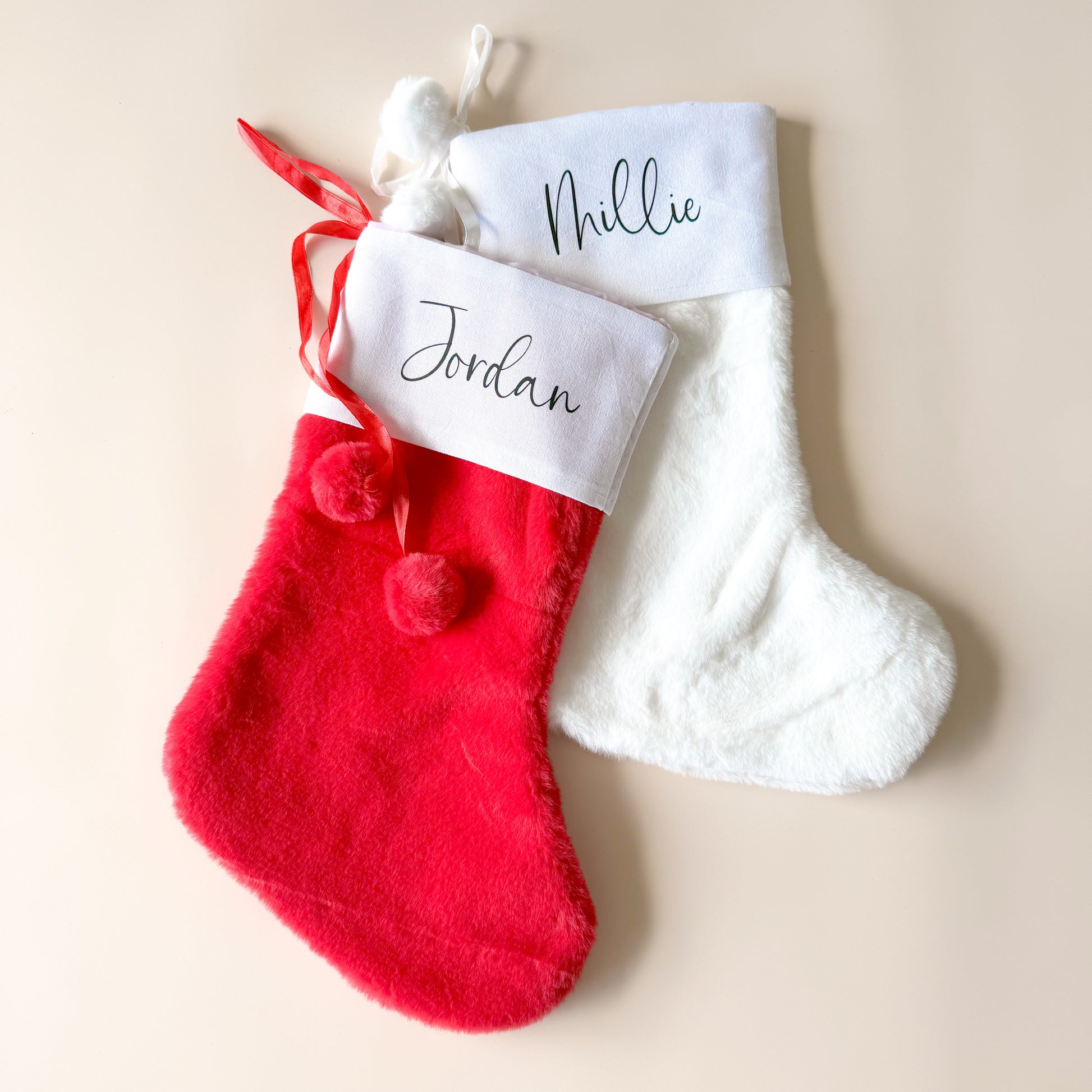 Made of super fluffy and soft material with 2 matching pom poms. Each stocking comes personalised with a name of your choice in black high quality, long lasting heat transferred vinyl.