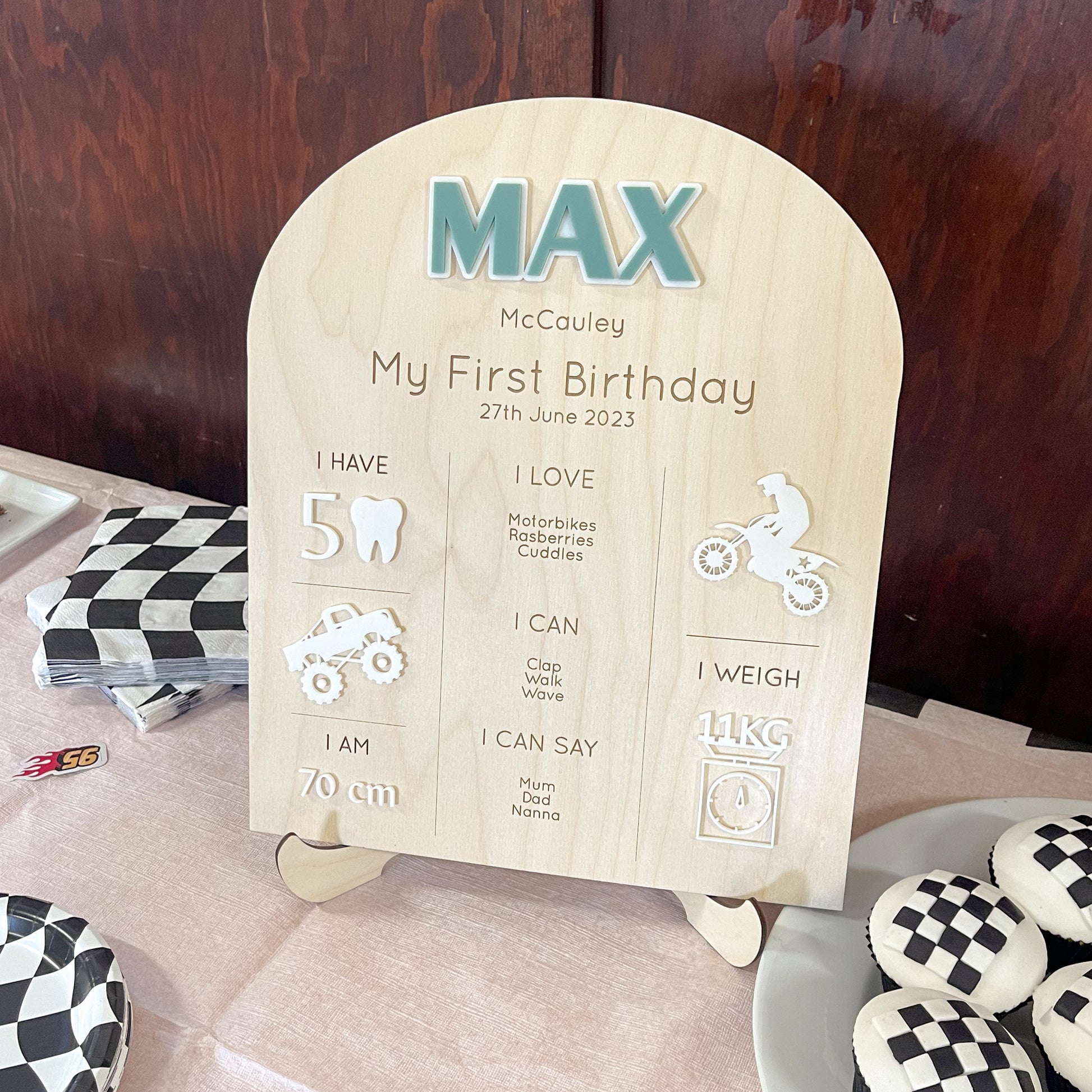 What better way to celebrate all of your little ones favourite things and clever skills than to display them at their first birthday party! Complete with a motorbike and monster truck to fit right in with your racing theme.