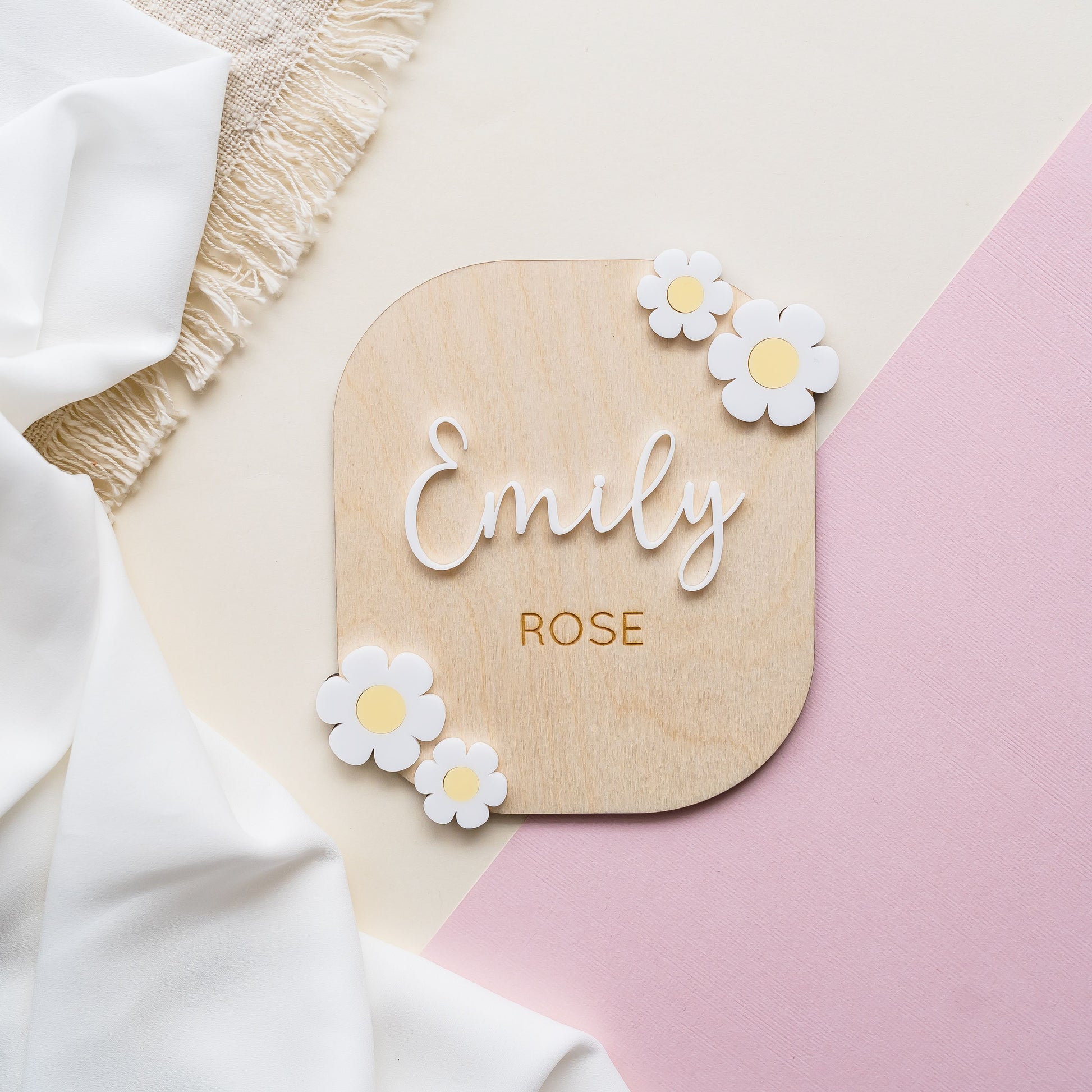 First name will be cut from white acrylic, any additional names will be engraved below