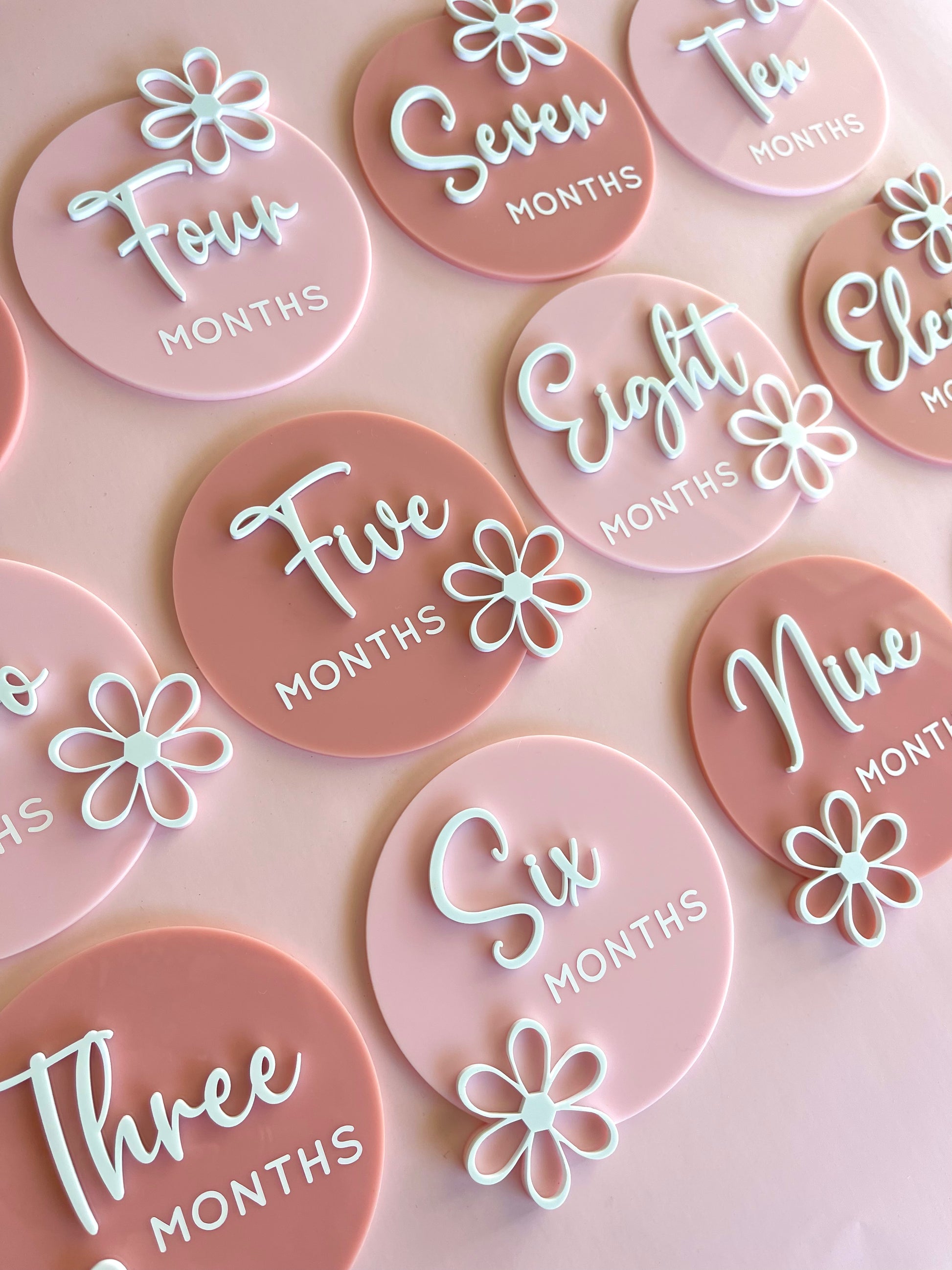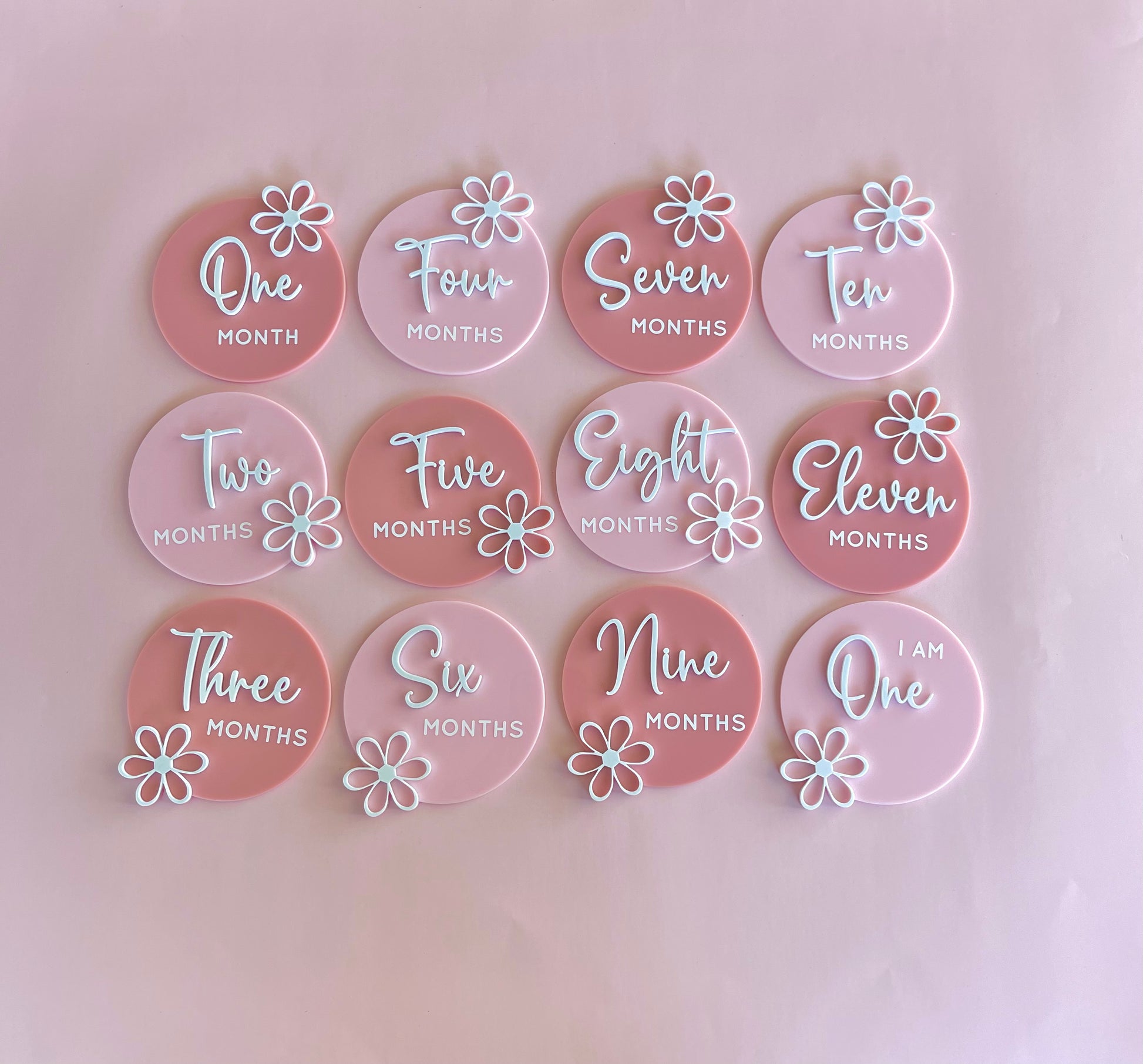 They are made with double layered 3mm thick acrylic, aprox 10cm in diameter and are available in a large variety of colours to go with every theme, this set pairs perfectly with our Daisy Birth Announcement Disc!