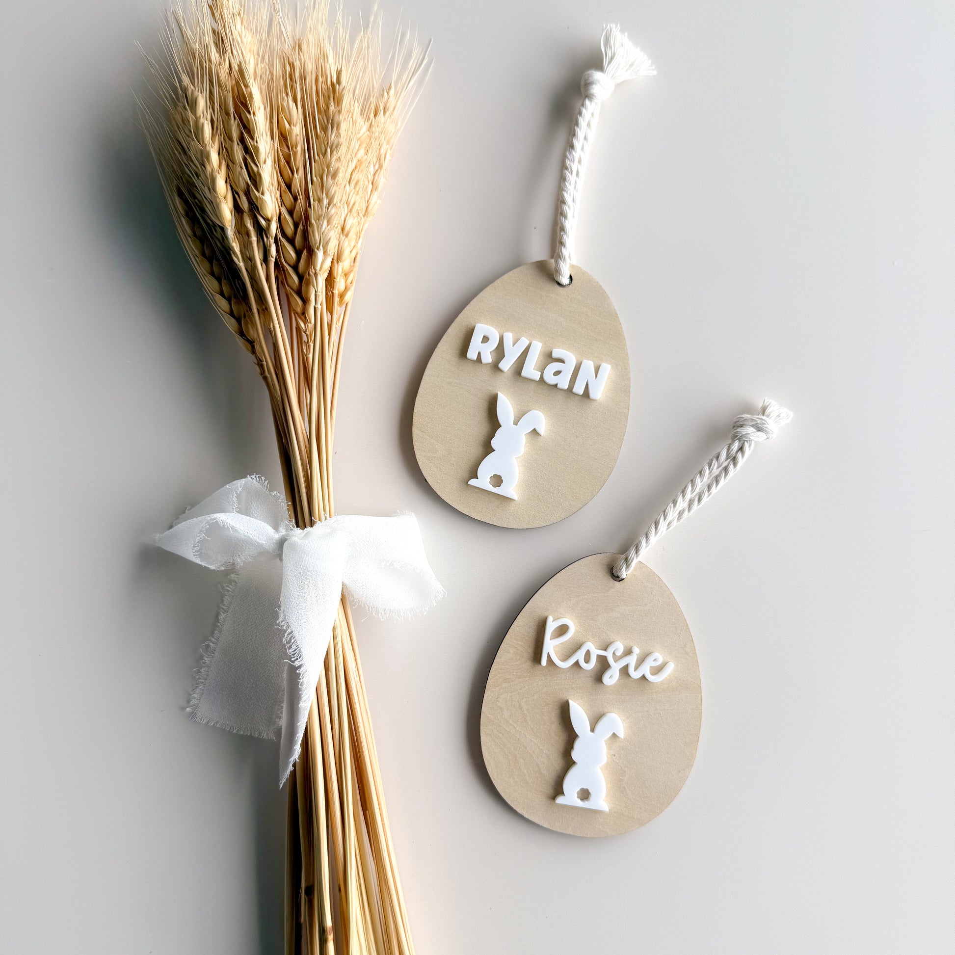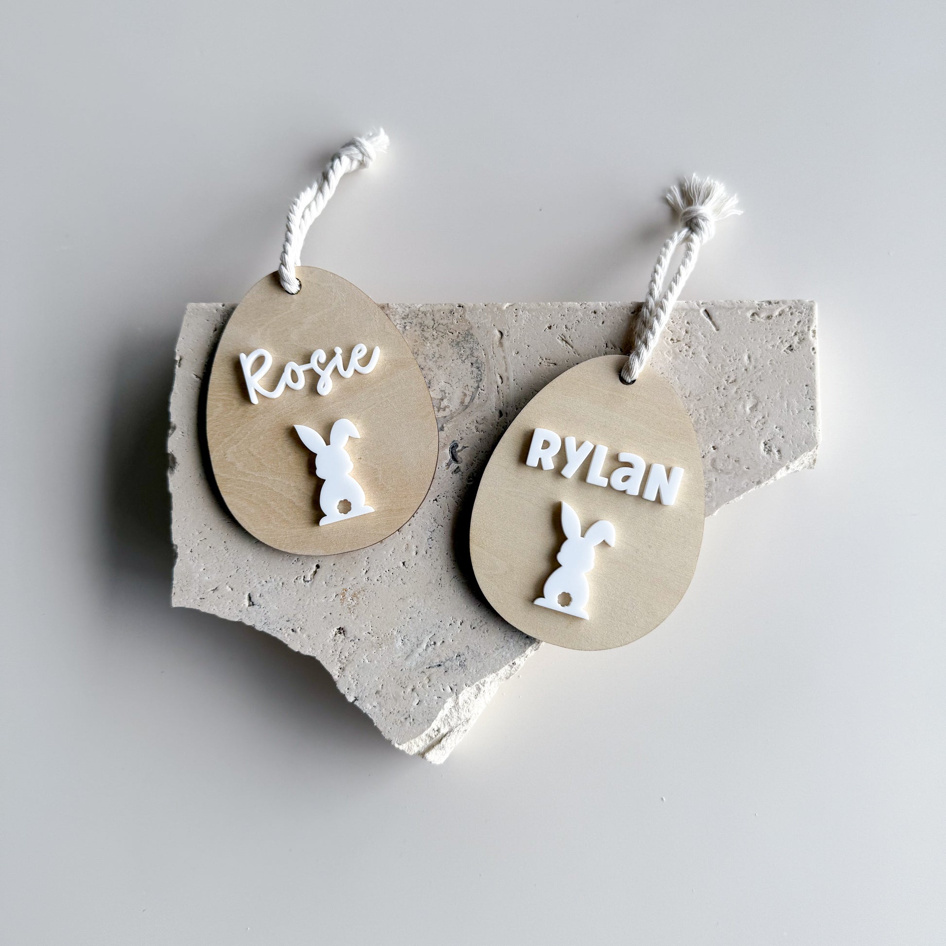 Make sure the easter bunny knows where your basket is to leave some special treats! Plywood egg backing with an acrylic personalised name and bunny icon