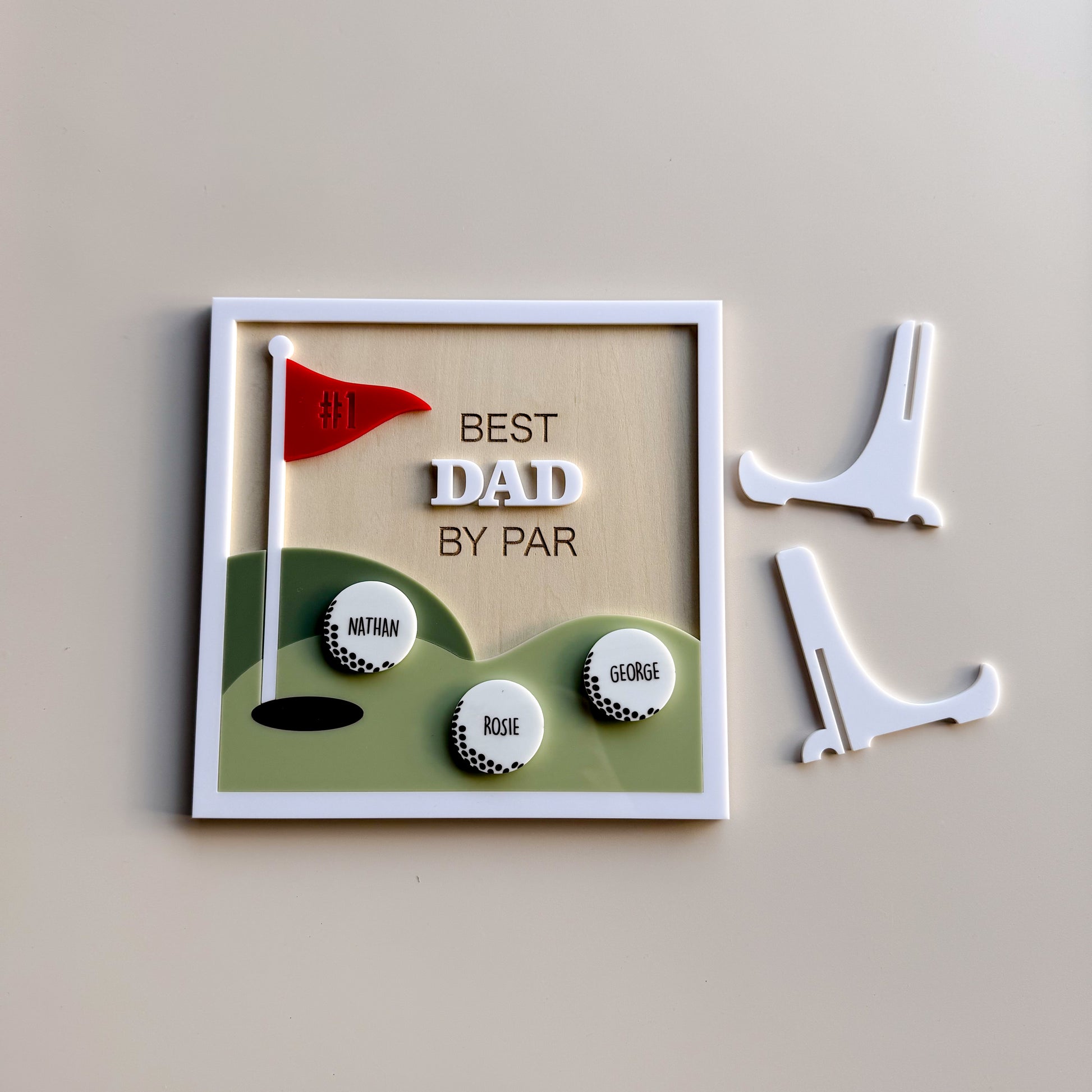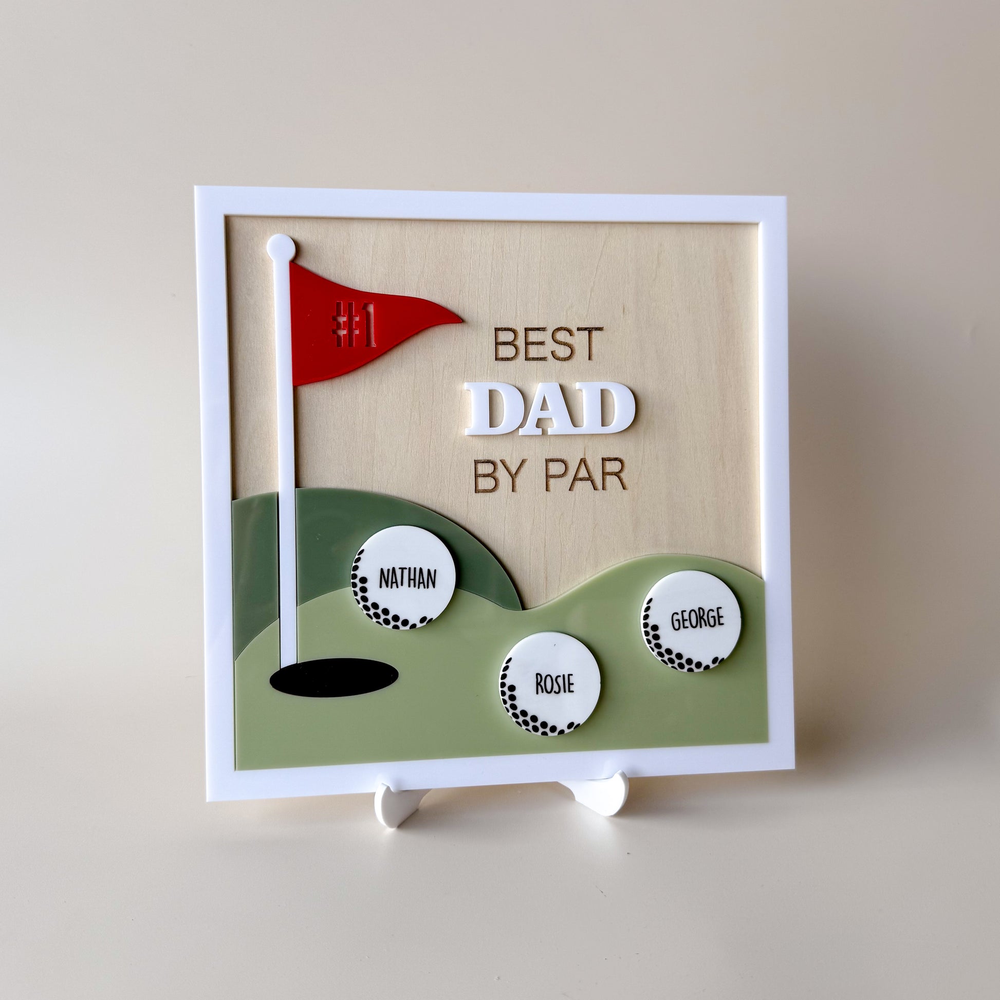 This charming 20x20cm sign features layered acrylic details including a red flag, green hills, and customisable golf balls representing each child. Each golf ball is personalised with your children's names, making it a truly special and thoughtful gift. Crafted from premium acrylic and plywood, this piece is designed to stand out and be proudly displayed.