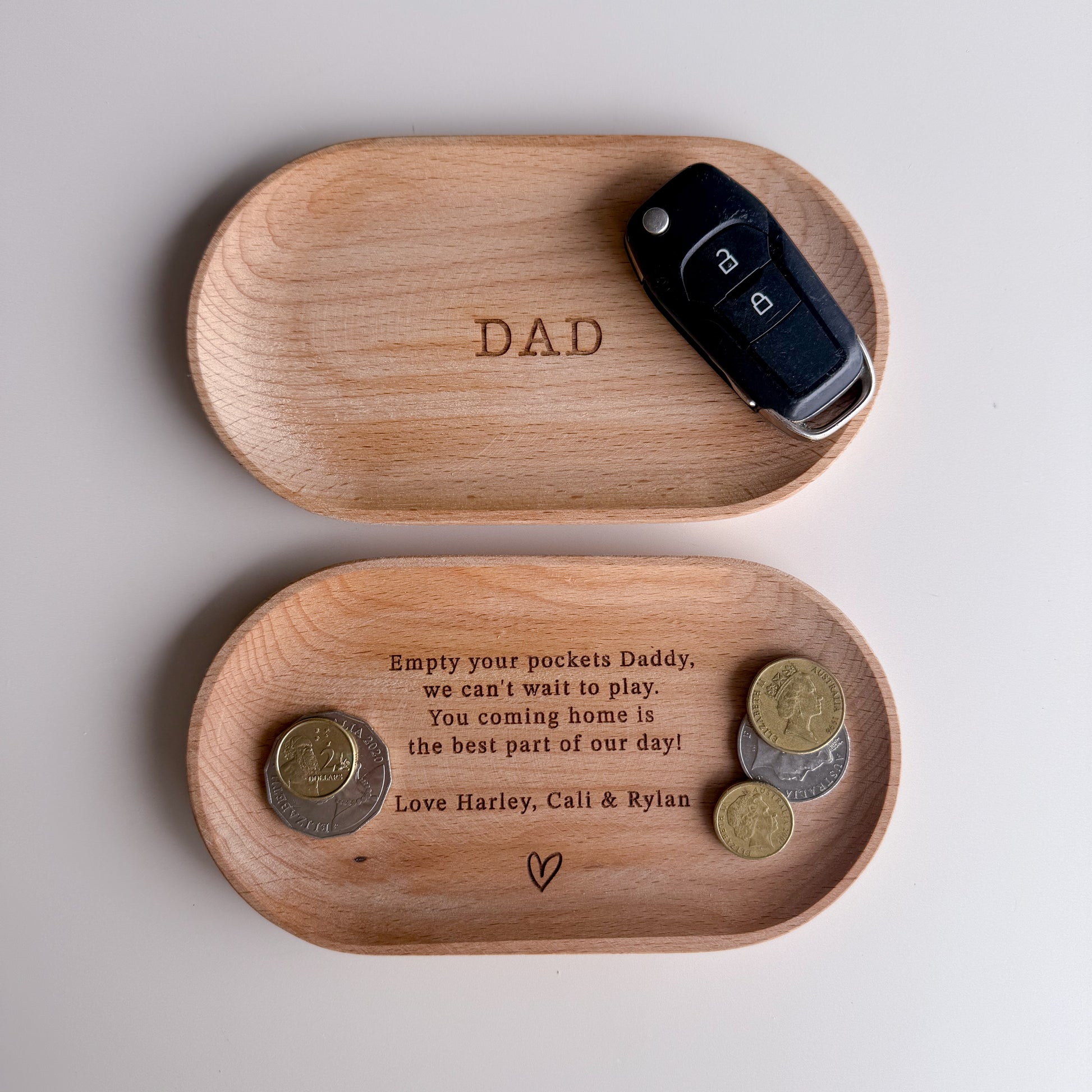 Give Dad a special place to drop his keys, coins, and bits and bobs with this personalised wooden trinket tray, a thoughtful and practical gift he’ll use every day.