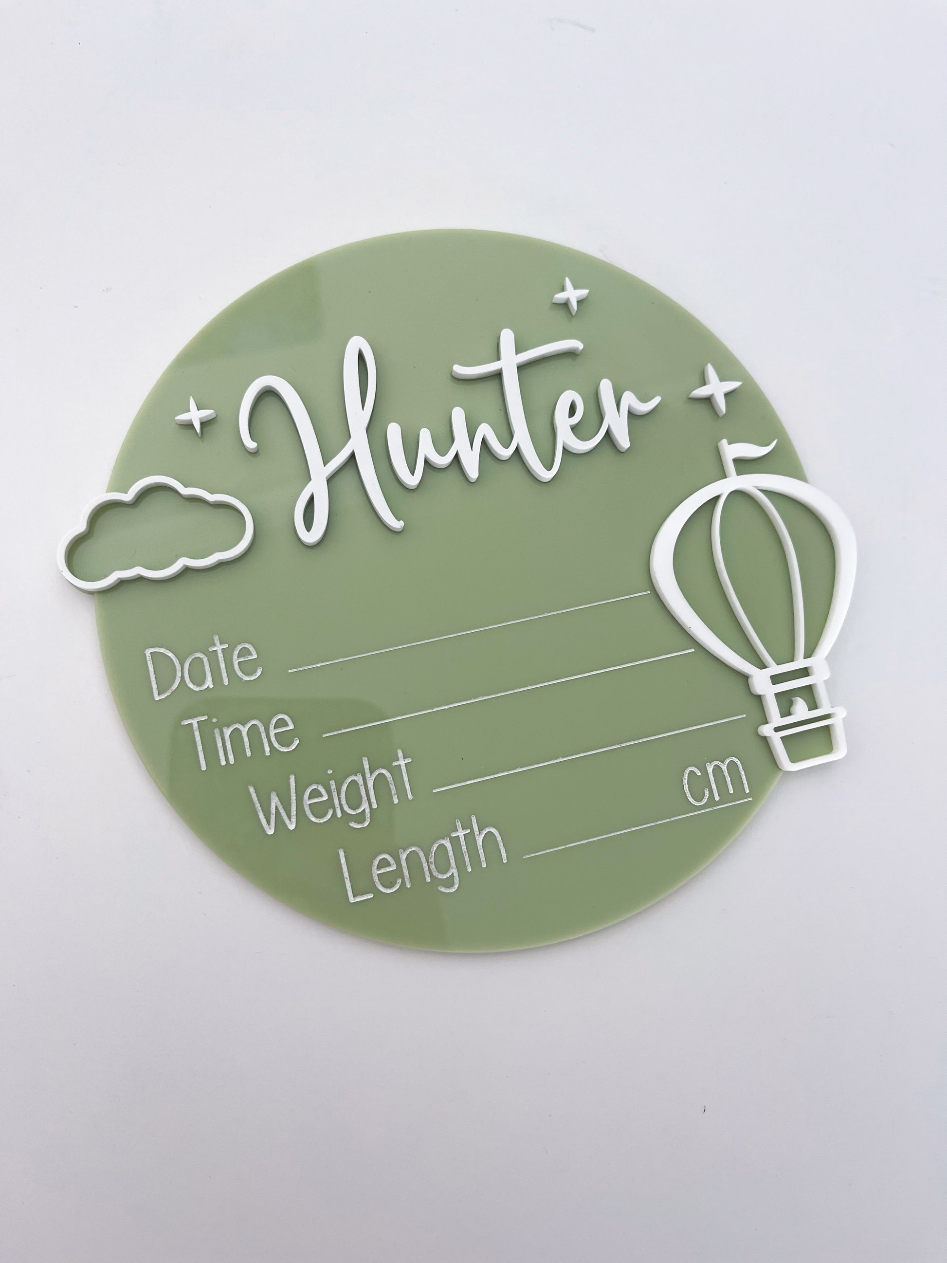Hot air balloon themed birth announcement, with spaces to fill in your little ones important birth information.