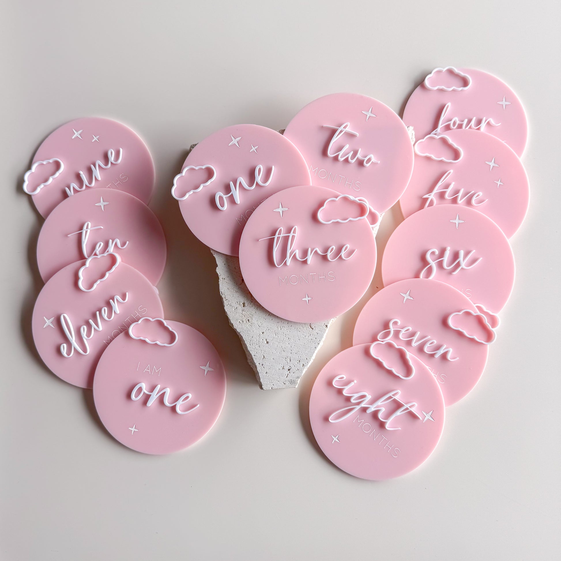 The stars and "month/months" will be engraved and paint filled in white the cloud and the numbers "one, two etc" will be 3D white acrylic