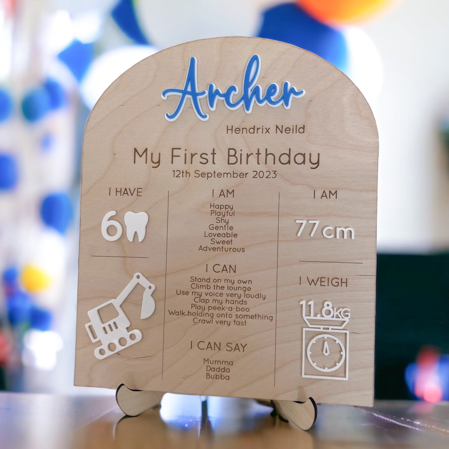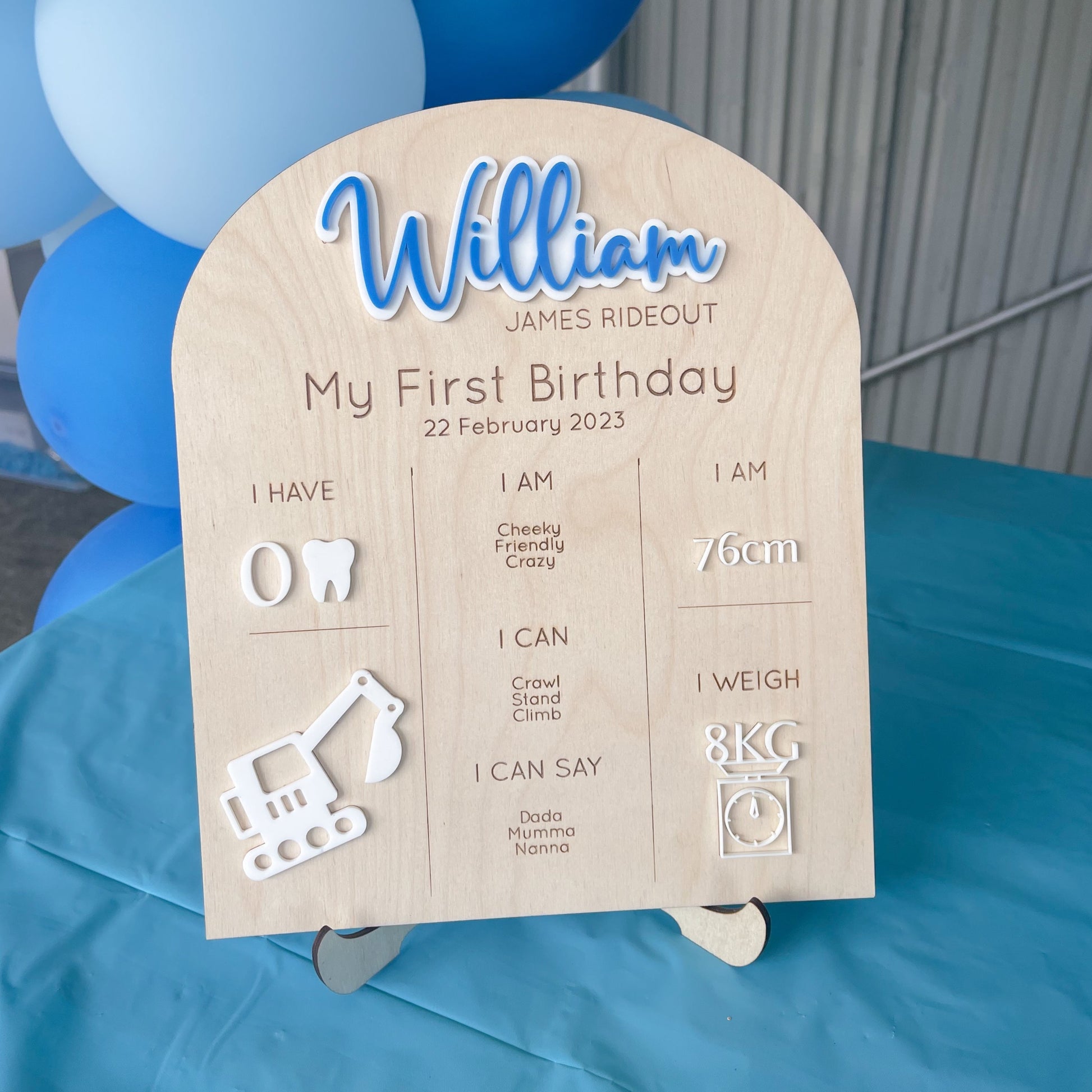 What better way to celebrate all of your little ones favourite things and clever skills then to display them at their first birthday party! Complete with an excavator to fit in perfectly with any construction theme party!