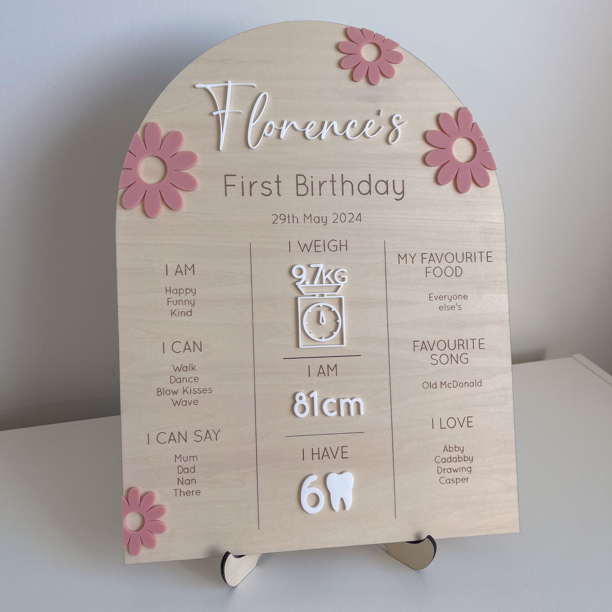 Personalised to your child with their weight, height and number of teeth along with a bunch of other favourite things plus things they can do/say.