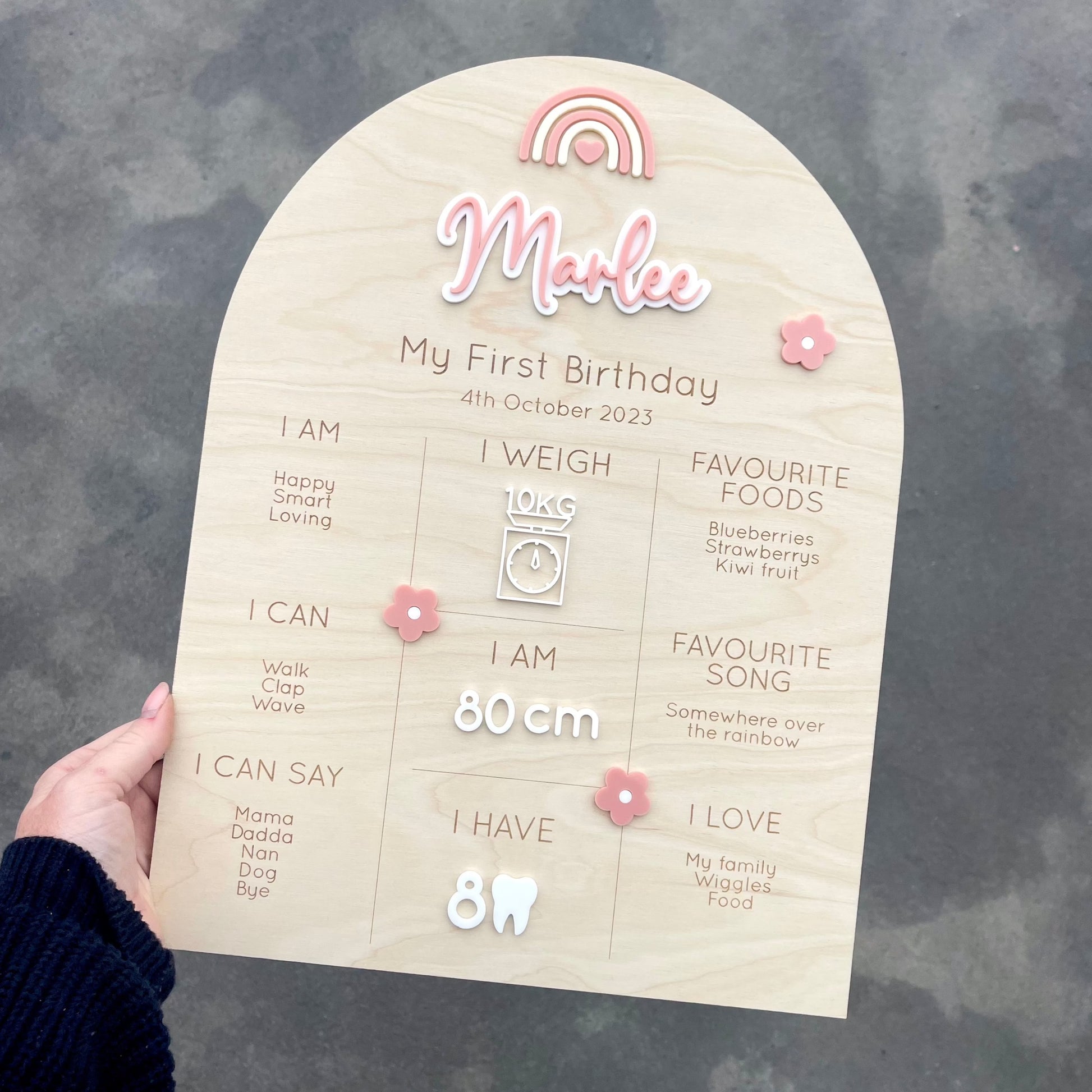 What better way to celebrate all of your little ones favourite things and clever skills than to display them at their first birthday party! This super cute design features a rainbow along with 3 daisies in the colour of your choice.