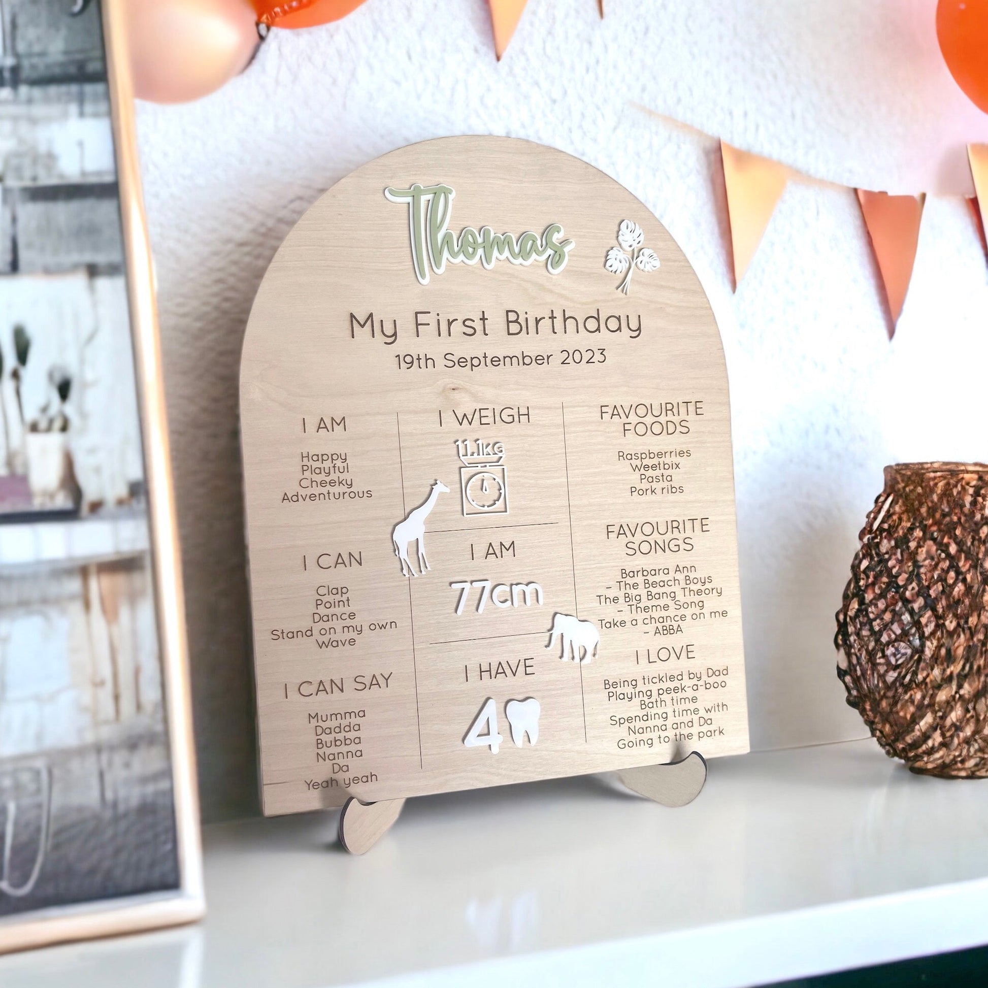 What better way to celebrate all of your little ones favourite things and clever skills than to display them at their first birthday party! Complete with an elephant, giraffe and monstera leaf to fit right in with your safari/jungle theme.