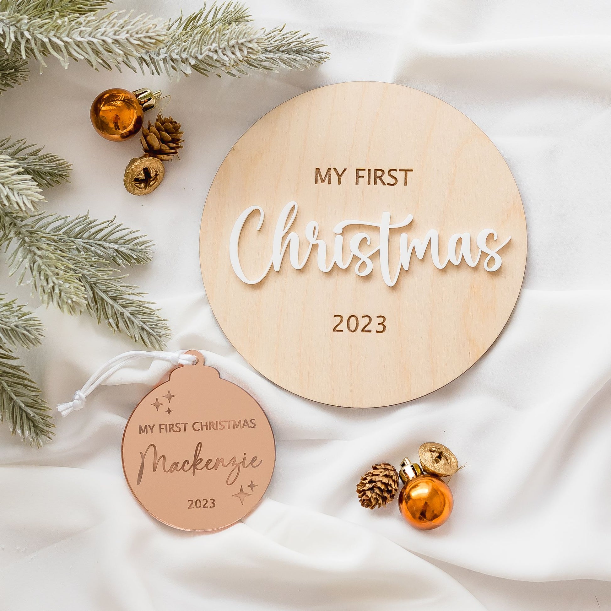 Make your little one's first holiday season memorable and bright with this adorable set - including a plaque to be used as a photo prop and memorable keepsake along with an engraved bauble to add that special sparkle to your tree!