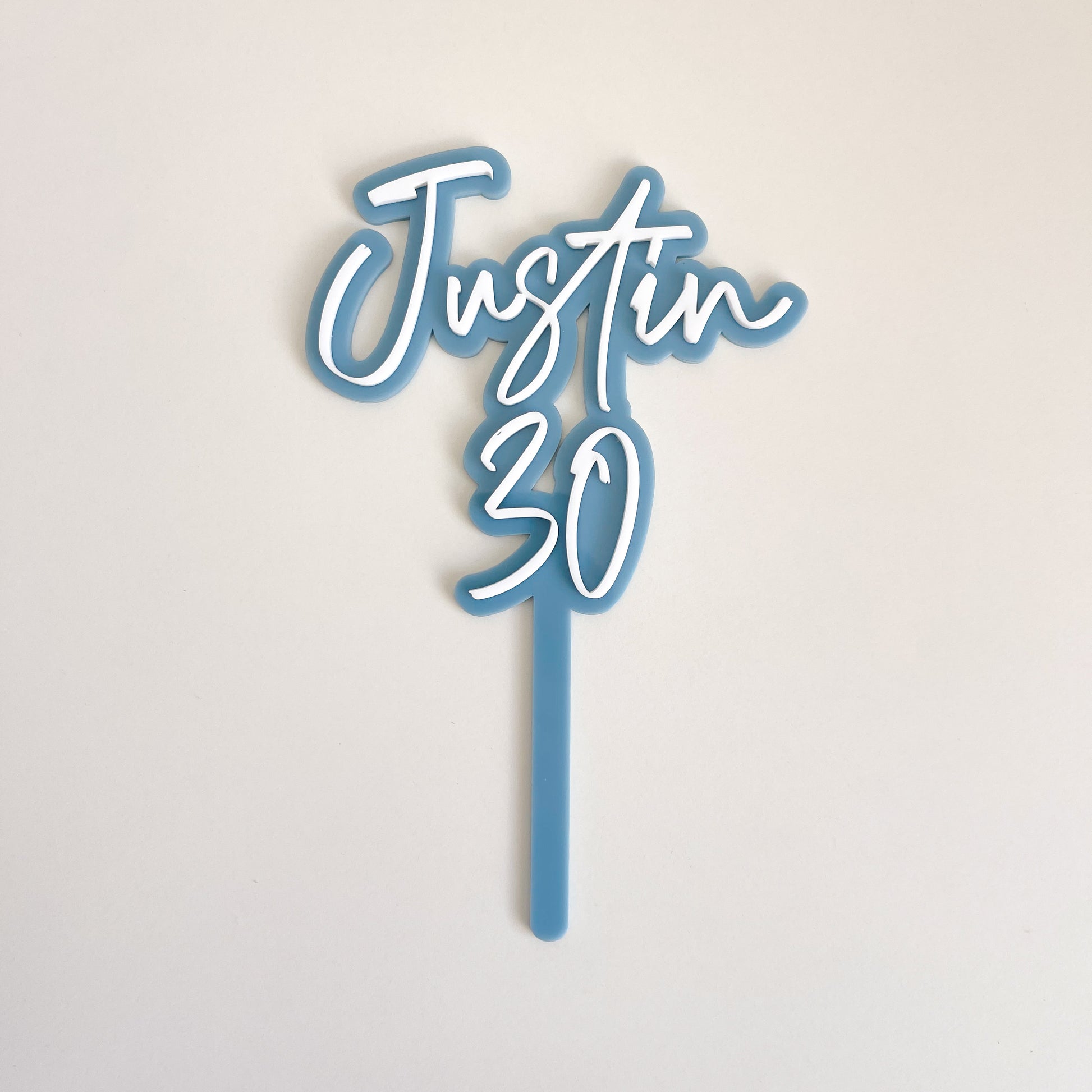 This custom cursive cake topper features a personalised name and age. Made from durable materials, it adds a special touch to any birthday celebration.