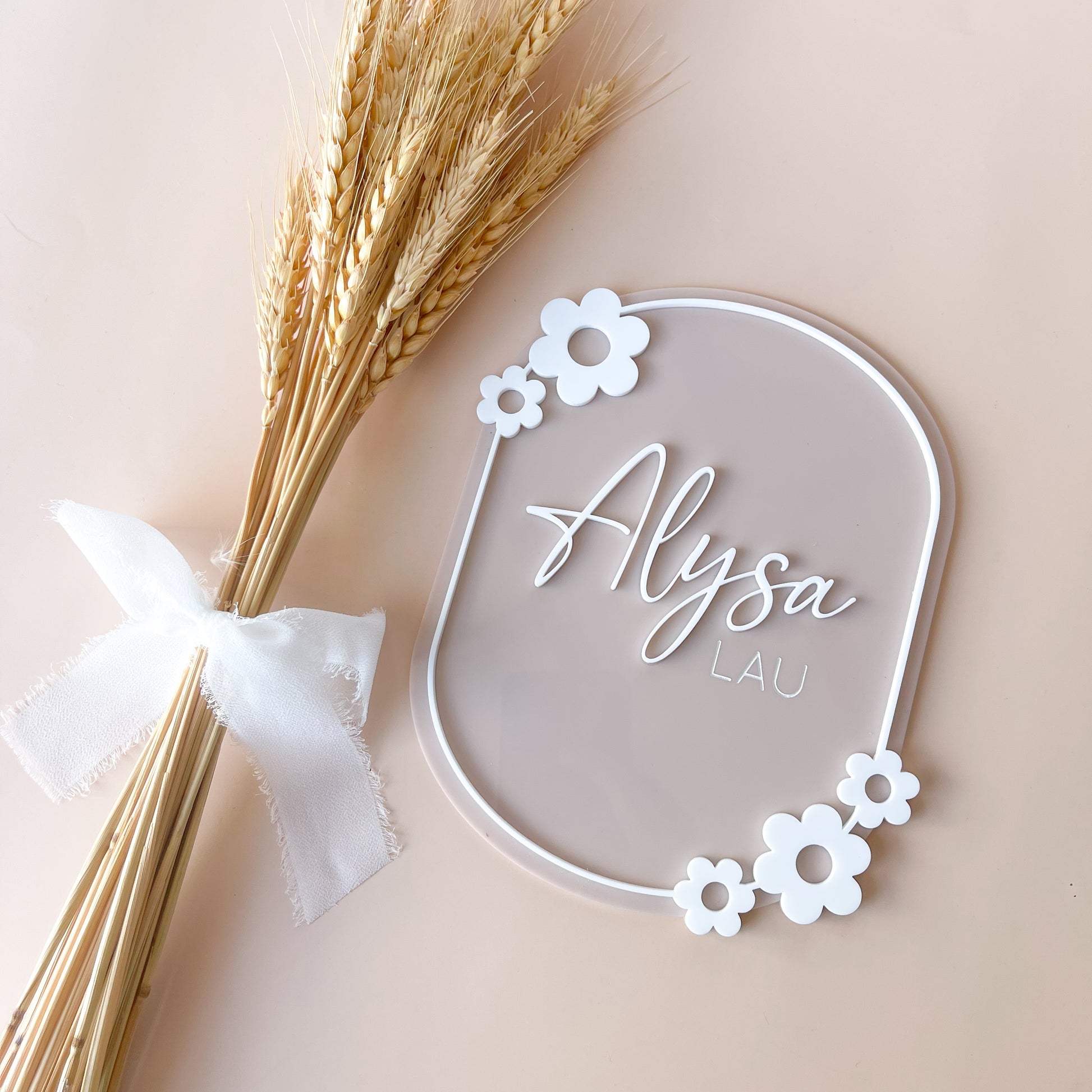 Acrylic name and border will be cut out of white acrylic, the chosen colour is for the base. Any engraving will also be paint filled in white.Â
