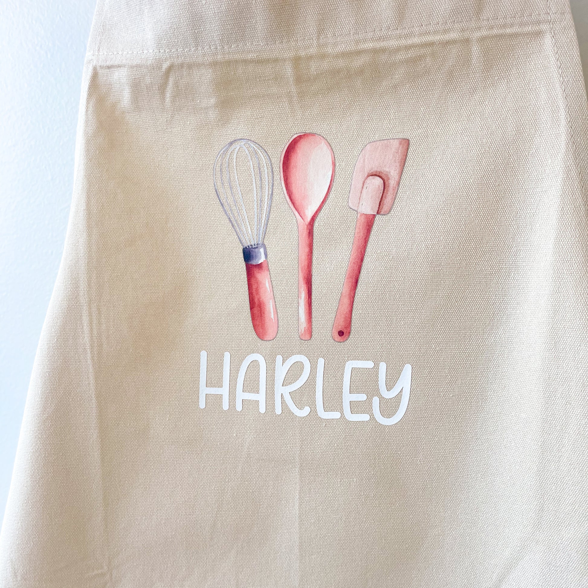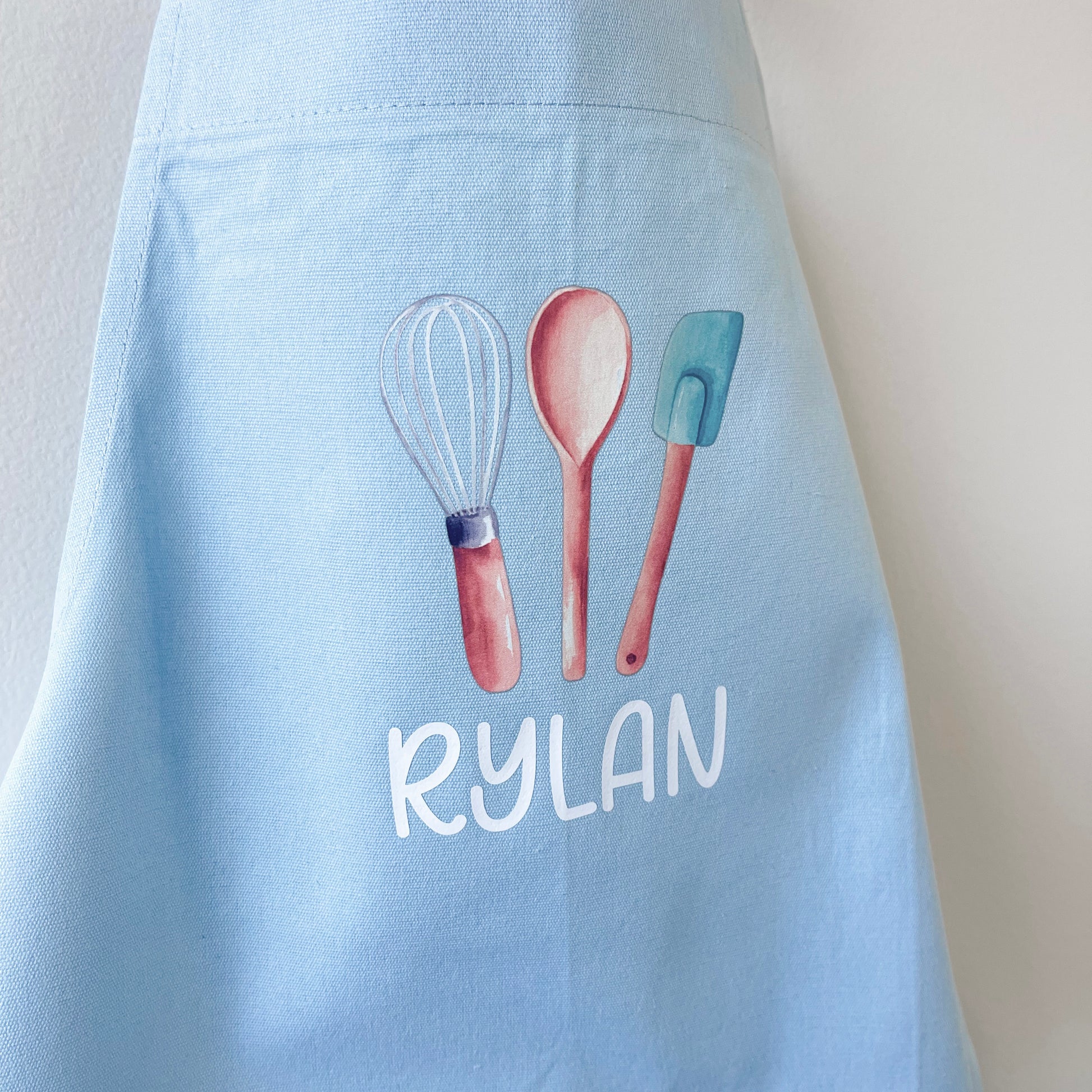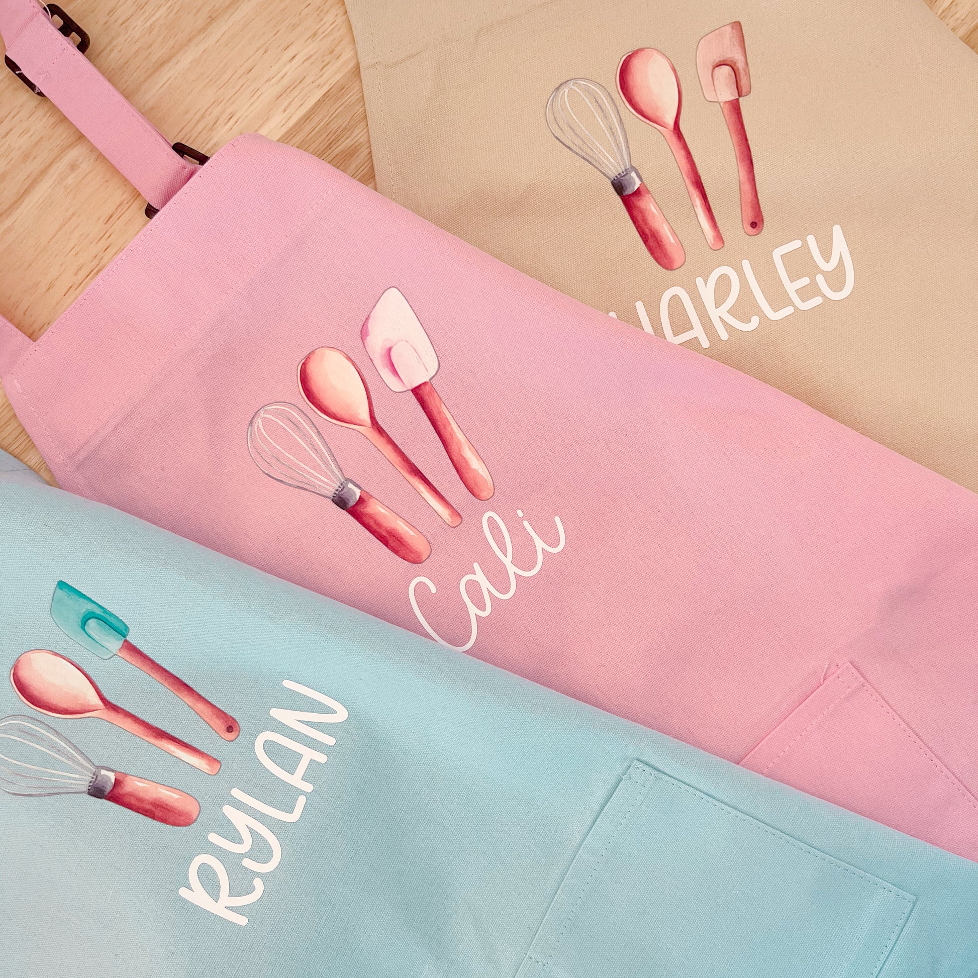 Each apron features a matching coloured spatular, whisk & spoon. Personalised aprons will have the name printed underneath in white, this can be done in a cursive or regular font. Names will be a maximum of 3cm in height or 10cm in width (Whichever comes first)