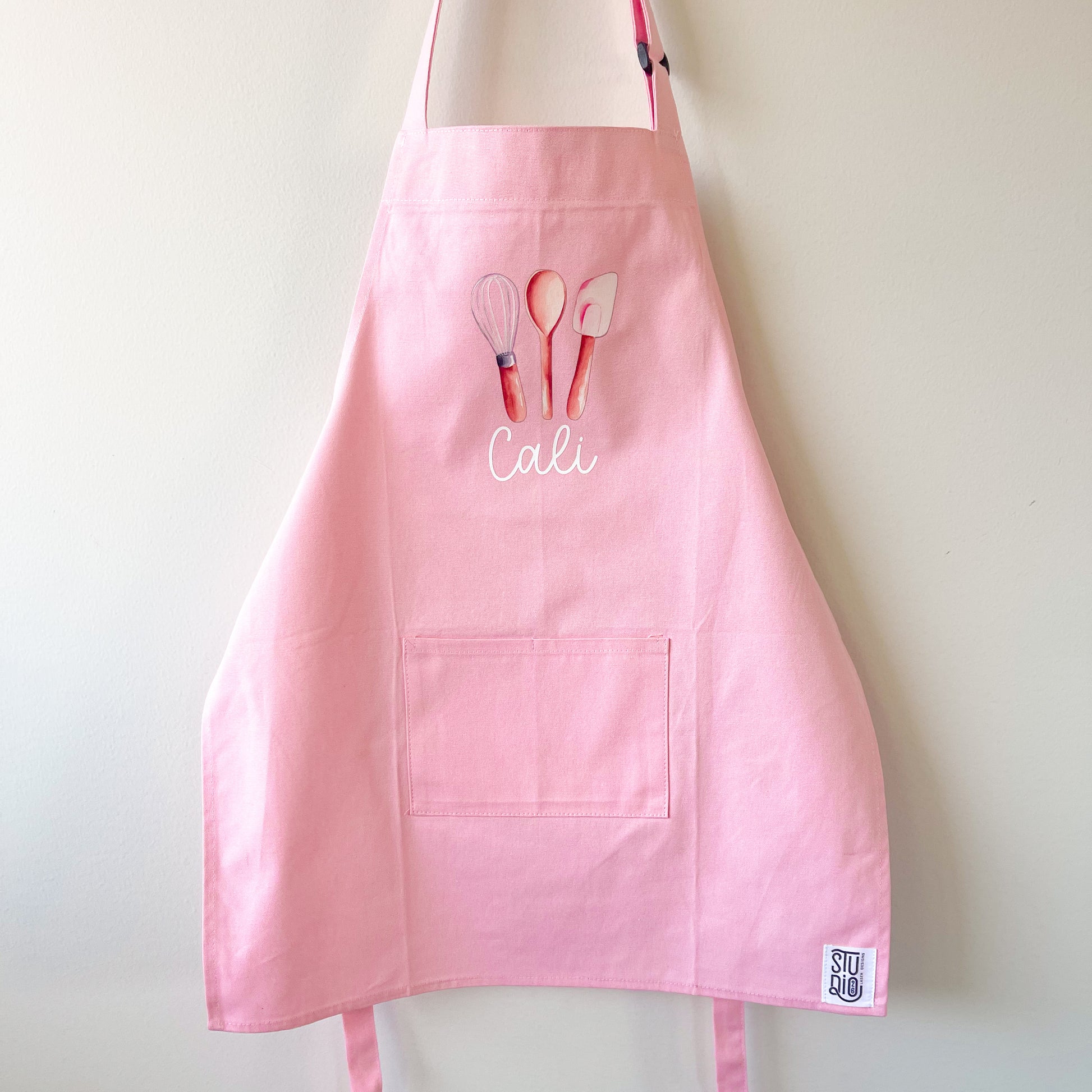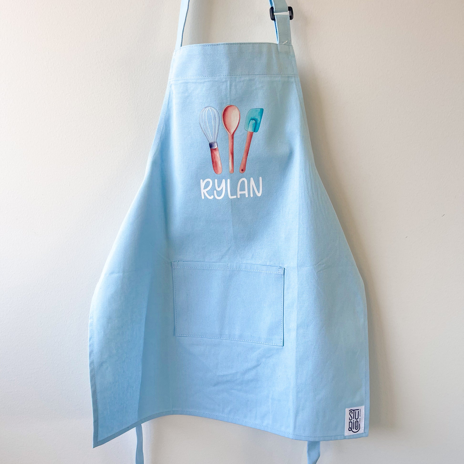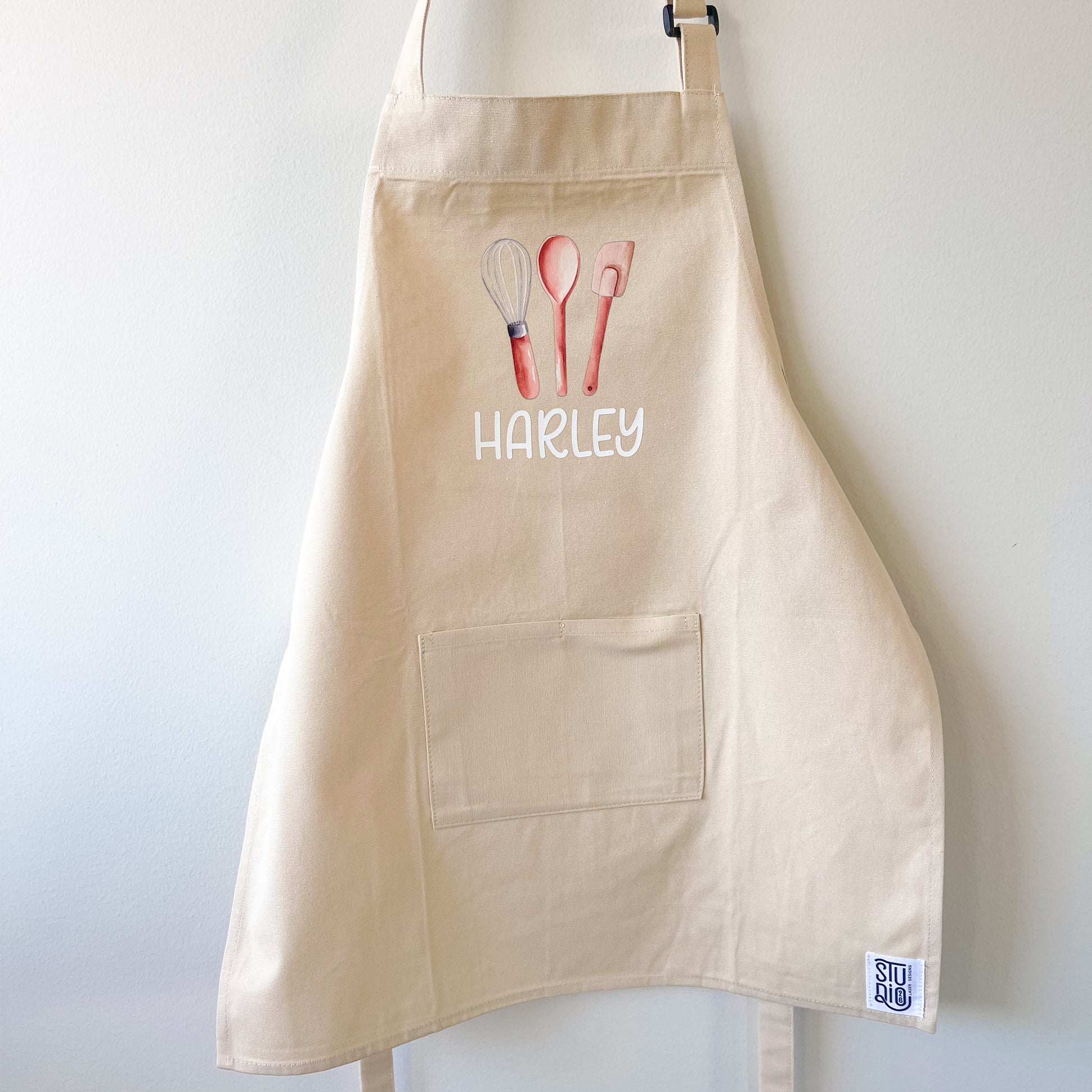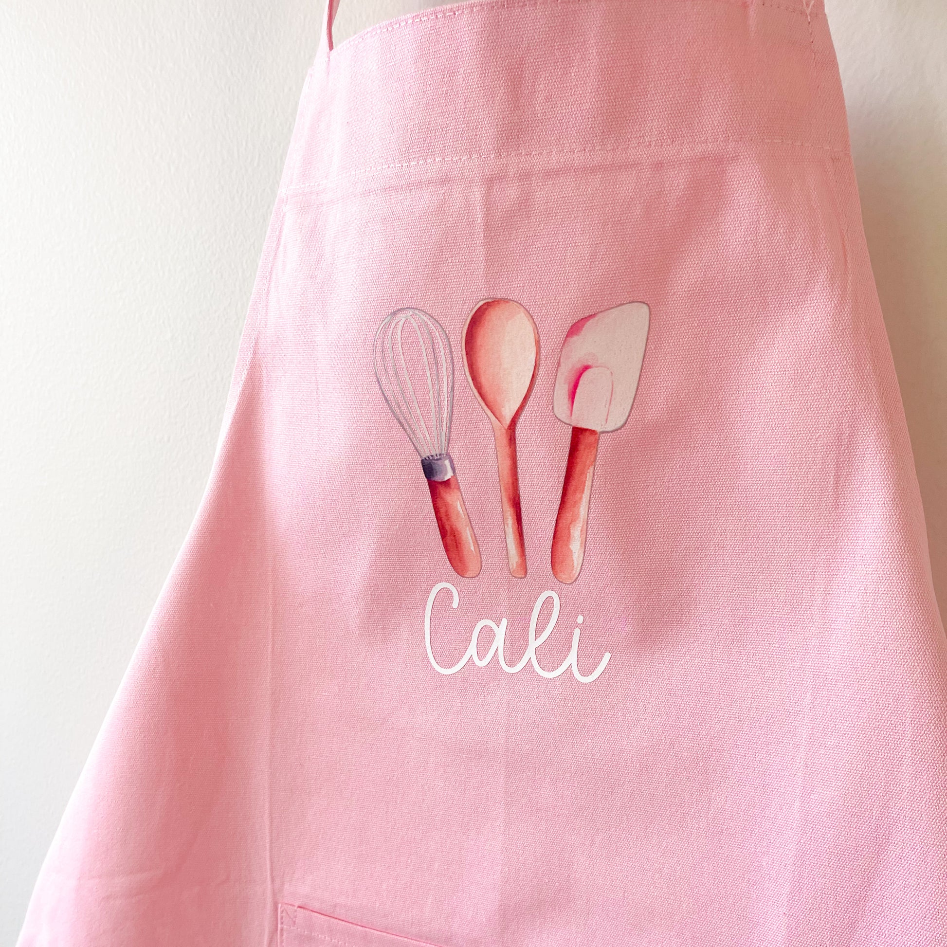 Each apron features a matching coloured spatular, whisk & spoon. Personalised aprons will have the name printed underneath in white, this can be done in a cursive or regular font. Names will be a maximum of 3cm in height or 10cm in width (Whichever comes first)