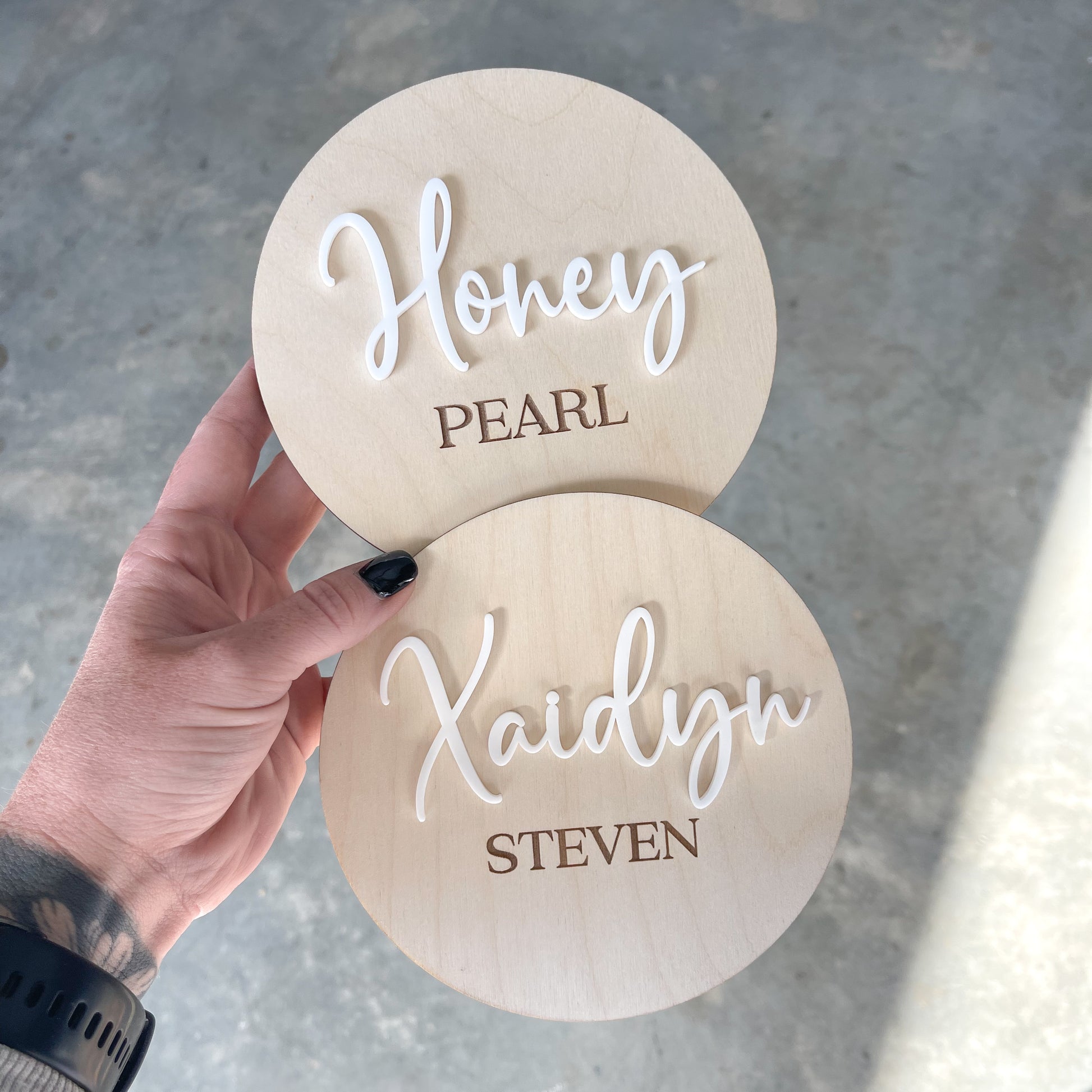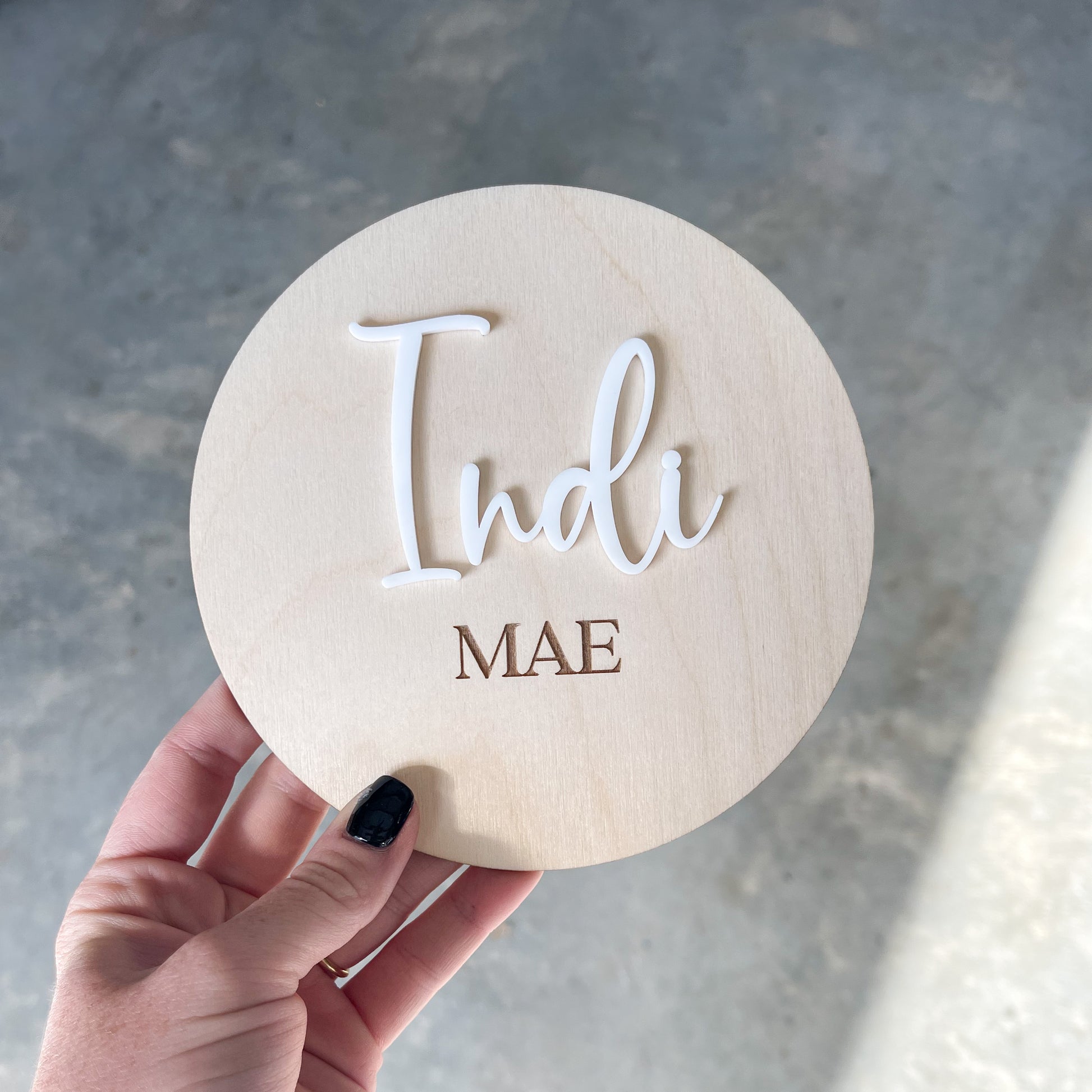 Announce your baby with this simple and elegant name plaque. Name 1 is cut out of acrylic and name 2 is engraved