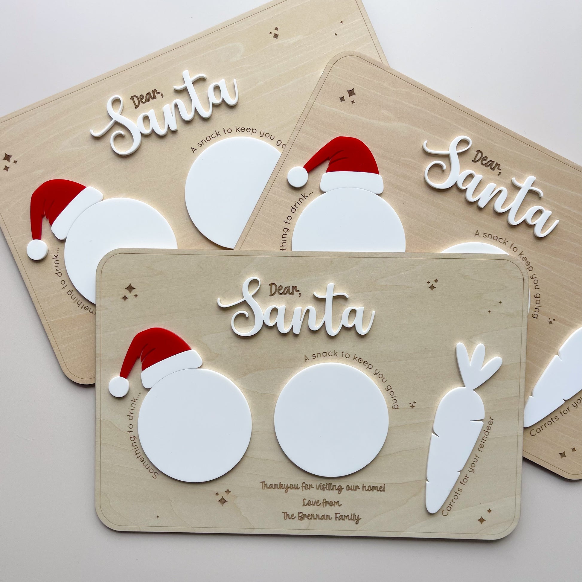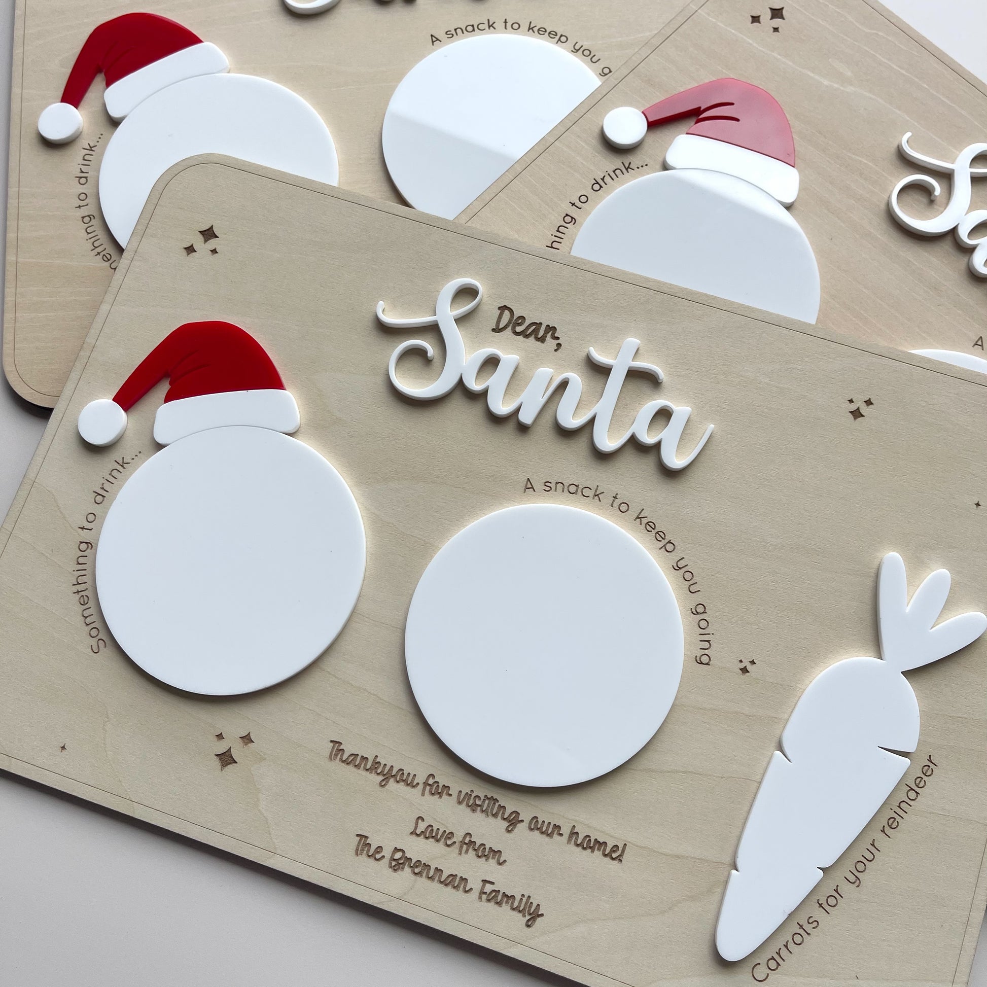 Leave Santas treats out on a fun treat board! Space for cookies, a drink and some carrots for the reindeers. Featuring a very christmasy red Santa hat!