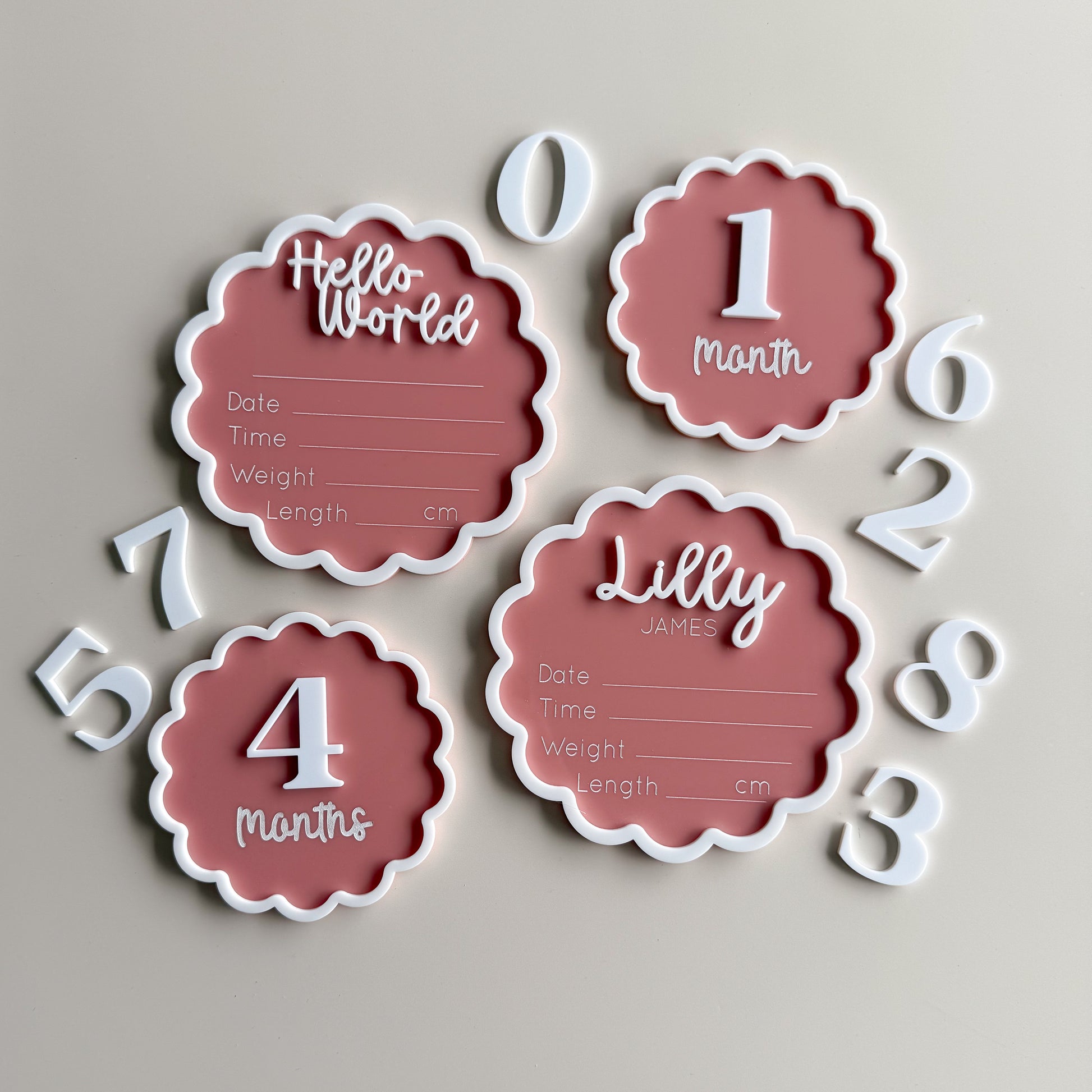 Each plaque measures 15cm wide and has a white name with a white scalloped border.